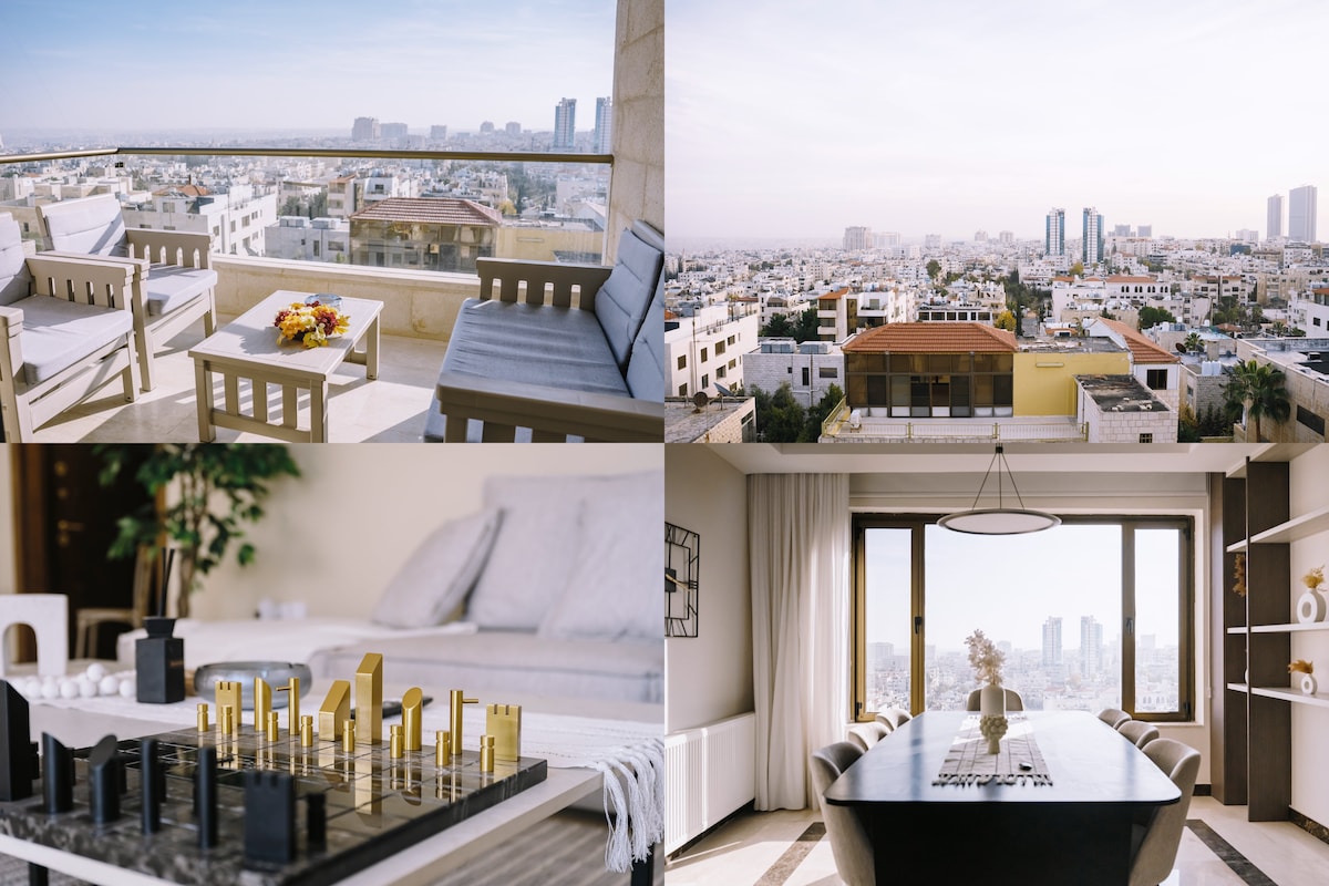 Features include: Two master suites with king-size beds & private bathrooms Additional queen bedroom + twin bedroom Open-plan living & dining with 70” Smart TV and 8-seater dinning table Fully equipped kitchen with dishwasher & breakfast nook Cozy family/games room with fireplace Balcony overlooking Amman Free basement parking Just a 10-minute walk to Al Rabieh shopping district with restaurants, cafés, shops, pharmacies, and supermarkets Queen Alia International Airport is only 25 minutes away