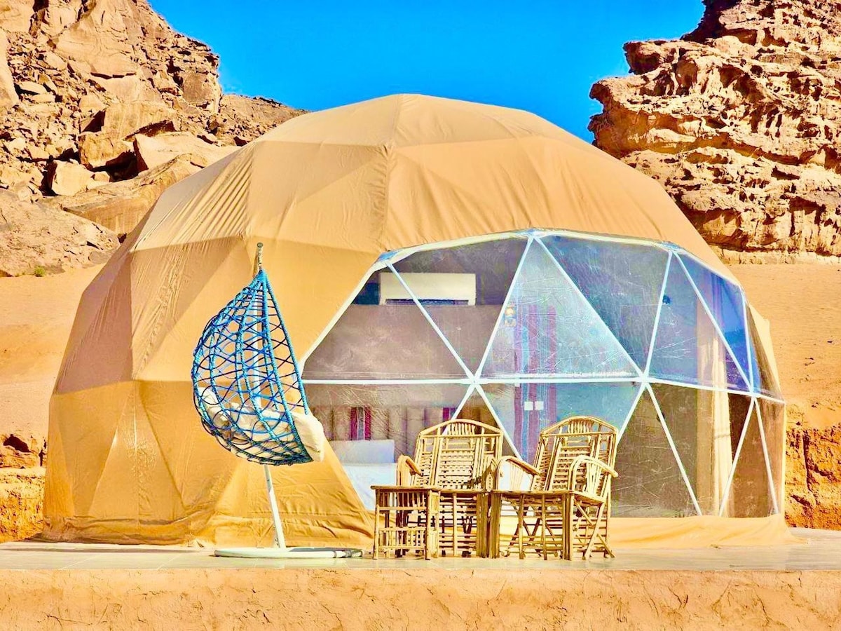 The most beautiful location in the Wadi Rum desert, nestled among towering mountains. Luxury bubble tents in Wadi Rum. All activities available: jeep tours, camel rides, and nighttime stargazing excursions. We're not the only ones in Wadi Rum, but we're the best. All meals are available, prepared in the traditional Bedouin style under the sand, with a full range of vegetarian options. The most beautiful bubble tents in Wadi Rum