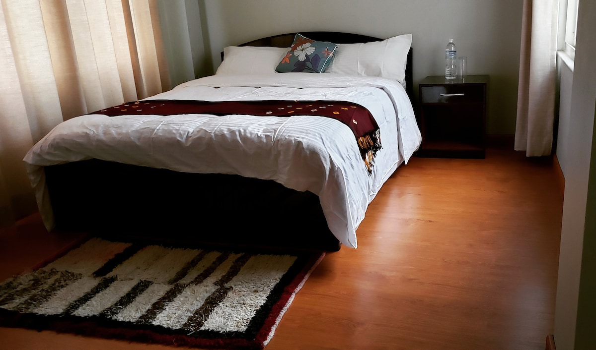 1 KING SIZED SINGLE BED . IT CAN BE SEPARATED INTO TWO SINGLE BEDS ON YOUR REQUEST. ONE BEDROOM. ONE LIVING ROOM, ONE KITCHEN, ONE BATHROOM. NO BATH - ONLY HOT SHOWER Centrally located with easy access to sights and scenes of Kathmandu. 15 minutes drive from the airport, 10 minutes drive to the center of the tourist area.