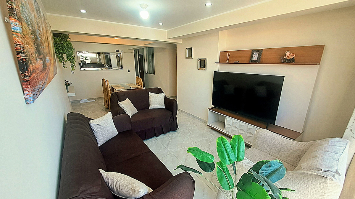 El departamento que ponemos a su disposición está ubicado en el primer piso. Cuenta con dos habitaciones: una con una cama de tamaño matrimonial y la otra con una cama queen, un baño compartido para ambas habitaciones, una sala comedor y una cocina americana. El departamento está en una zona urbana y comercial, cerca a varios restaurantes, discotecas, clínicas, universidades, etc. El check-in es a las 2:00 PM. Pero, pregúntenos si está disponible para un ingreso más temprano. ☺️
