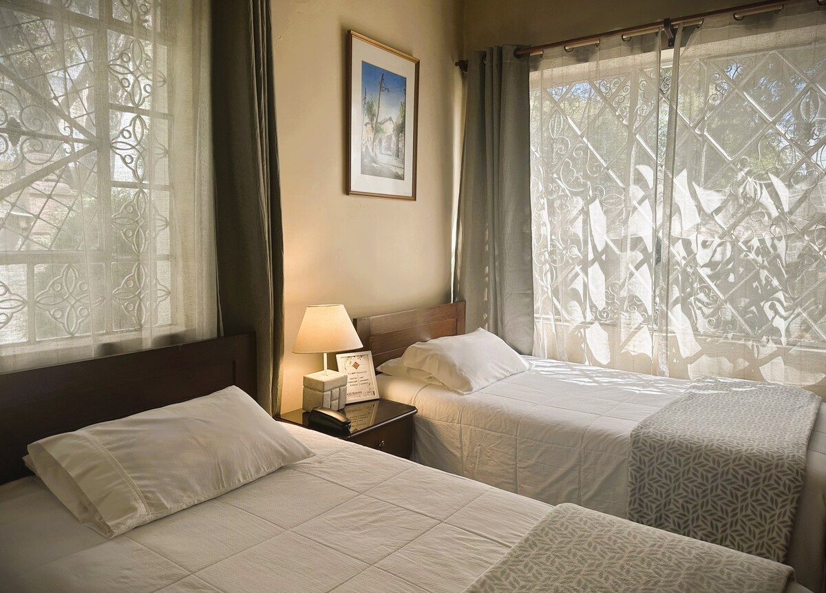 Esta habitación moderna y sofisticada mide 15 mt2, está equipada con una cama Queen con box spring, alfombra, TV de pantalla plana de 42 pulgadas, frigobar, caja fuerte, secador de cabello (a pedido), teléfono y baño privado con artículos de aseo gratuitos. Se proporcionan edredones de plumas y ropa de cama de la más fina línea hotelera. En las áreas públicas contamos con recepción 24 horas, lavadora, cocina, comedor y terraza. NO INCLUYE DESAYUNO (costo adicional)