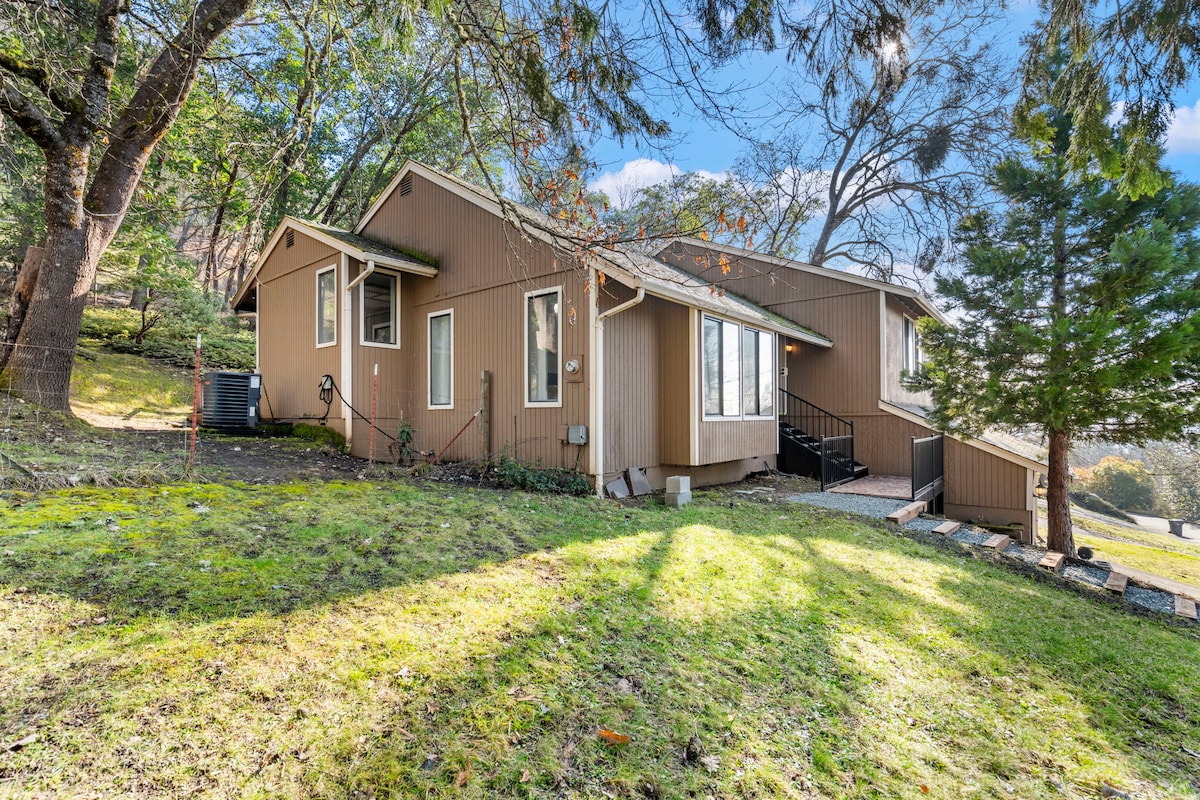 Secluded forest of 5 acres only 3.5mi to Grants Pass with a private trail into legendary Cathedral Hills. A 3/2 home with DSL Wifi, dining area, living room, pellet stove, a fun converted carport for dining/entertainment/BBQ as well as a hot tub out back. Property has a seasonal creek and pond, a safe 300' from the house, and a classic tree fort. Enjoy outdoor dining, hiking, biking, or relaxing in the quiet southern Oregon woods. We are pet friendly, require a $30 per pet fee, and limit 2