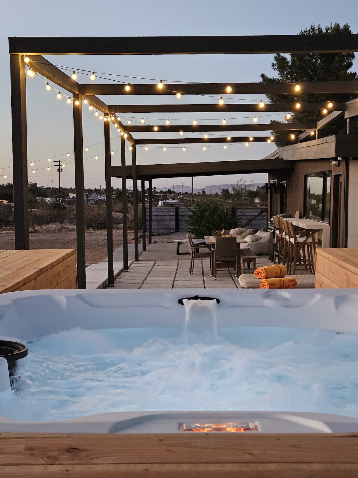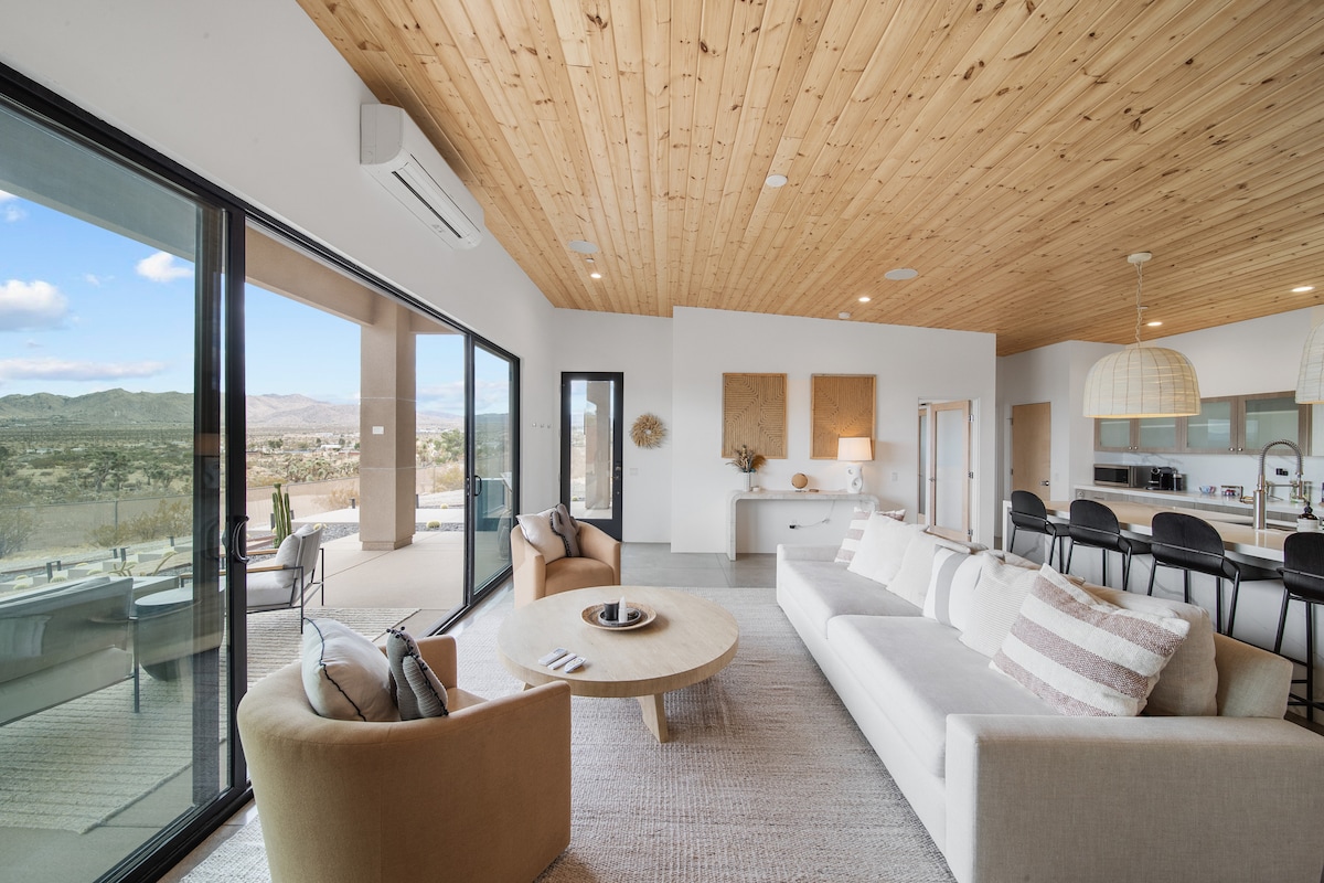 Step into Casa JT, the luxurious 2BR 2Bath oasis nestled on a secluded 2.5-acre property just 15 mins away from Joshua Tree National Park. Escape the hustle and bustle and immerse yourself in the spectacular desert ambiance in the private backyard, a perfect oasis for stargazing, entertainment, relaxing and much more! ✔ 2 Comfortable King BRs ✔ Open Design Living ✔ Full Kitchen ✔ Yard (4k Projector, Fire Pit, BBQ, Ping-Pong) ✔ Smart TVs ✔ High-Speed Wi-Fi ✔ Epic views ✔ Hot Tub See more below!