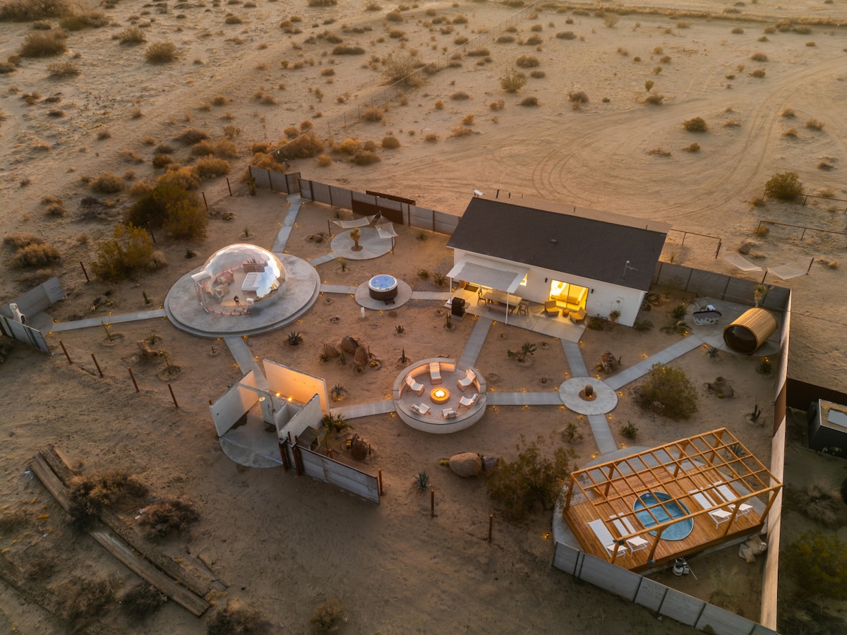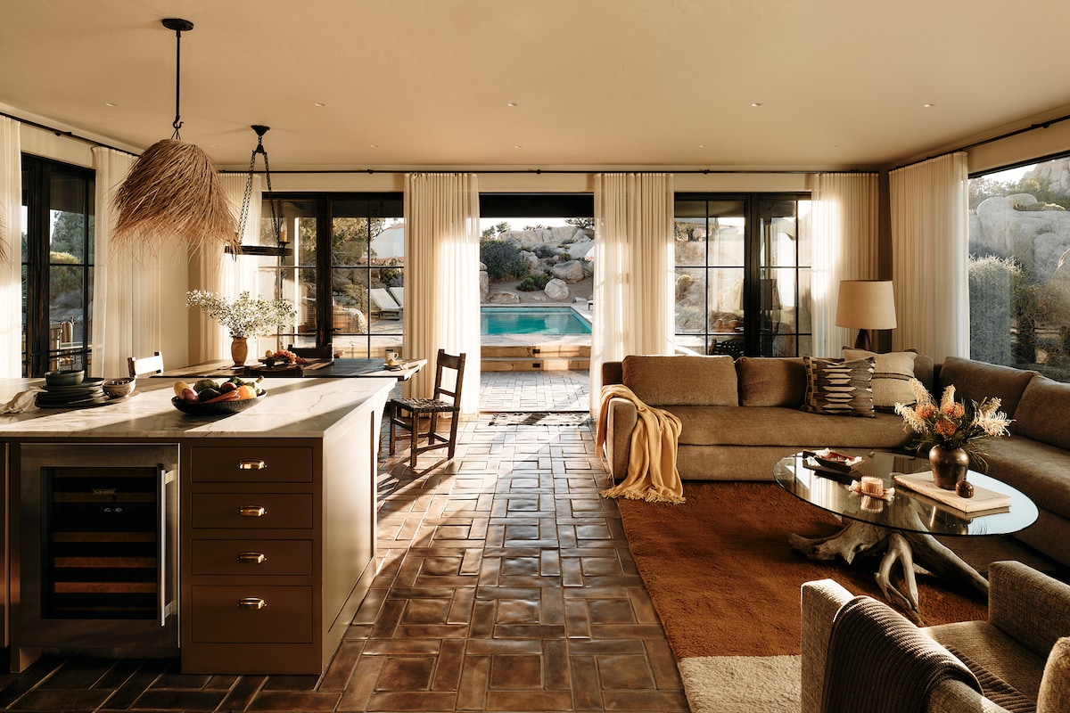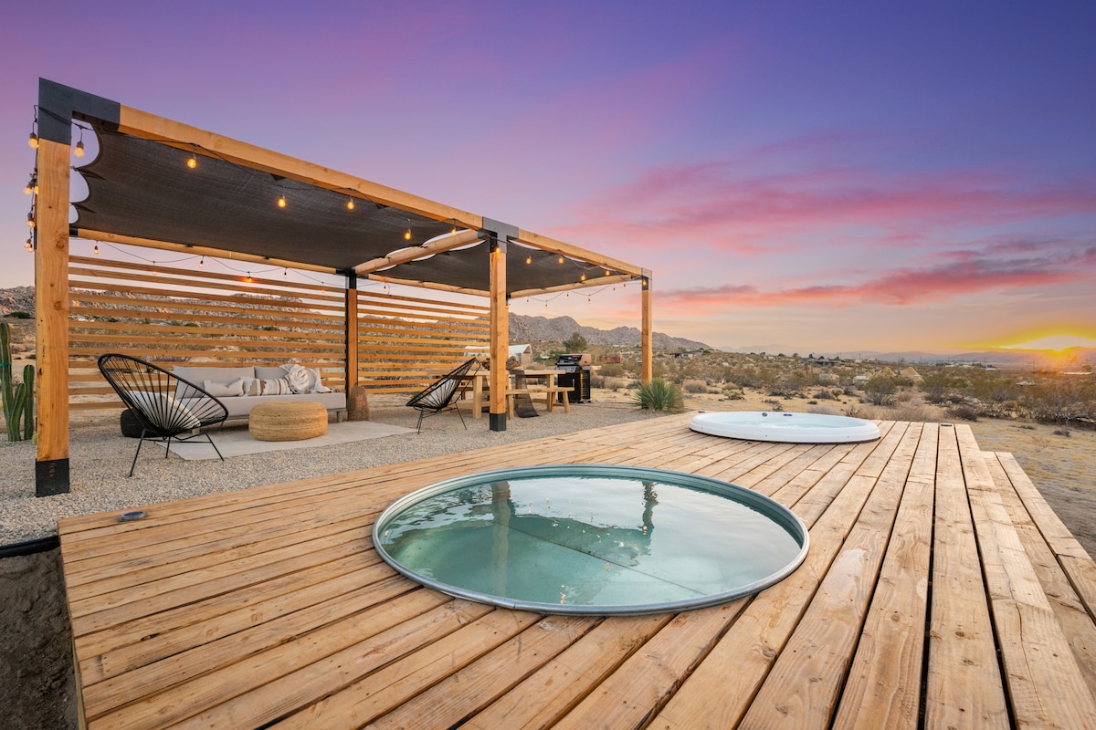 “Sphere In The Rocks” desert retreat w. cowboy pool, jacuzzi, fire pits, daybed, dining & BBQ! ★ “A magical space that encourages connection, reflection, and presence.”❤️ ✔️Architectural sound healing sphere ✔️ Recommendations → Concierge Chef & Sound Bath (ask us!) ✔️Fully equipped + stocked kitchen ✔️Reverse osmosis water filter ✔️Parking → driveway (4 cars) ✔️50 Mbps wifi + workspace ✔️Outdoor shower + tub + fire 3 mins → Joshua Tree National Park Entrance 10 mins → Downtown Joshua Tree