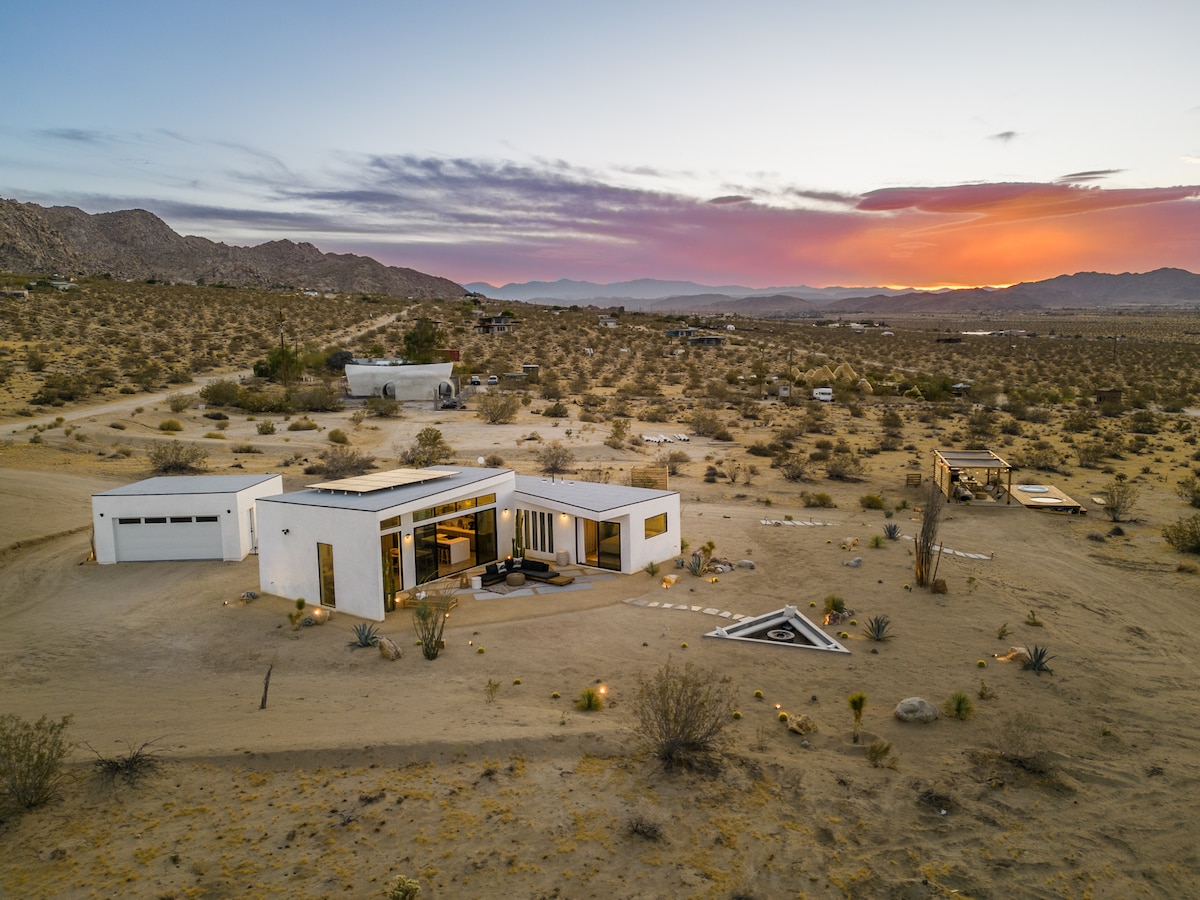 Spa themed custom estate on 30 Acres, only 4 miles to the center of Joshua Tree. Featured in Travel + Leisure, Domino, San Diego Mag and more. With no immediate neighbors, you can truly relax. Gaze out giant windows towards 100+ Joshua Trees & the national park. Amenities include a brand new pool & sun deck, oversized custom sauna, cold plunge, 8 person hot tub, separate yoga / group dining building, outdoor shower, chef's kitchen, EV charger, smokeless firepit and a private disc golf course.