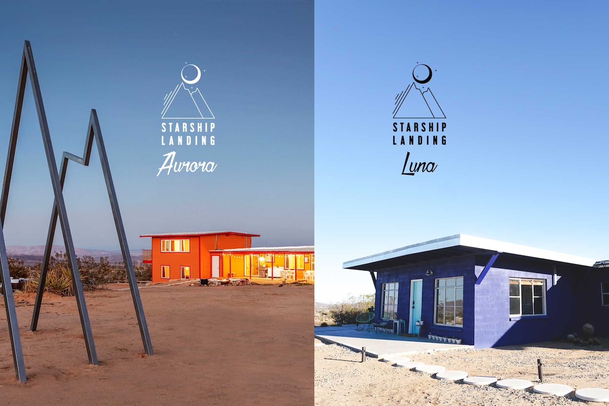 Nestled on 5 private acres, Starship Landing: Luna offers a fun and relaxing escape in the heart of the Joshua Tree area. Directly bordering 154,000 acres of protected land in the stunning Sand to Snow National Monument, natural beauty and vast open spaces feel otherworldly right outside your door. After a day of exploring the desert, unwind with a dip in the hot tub or cowboy tub pool, enjoy a starship-themed disco, and finish the evening stargazing around the fire pit under expansive skies.