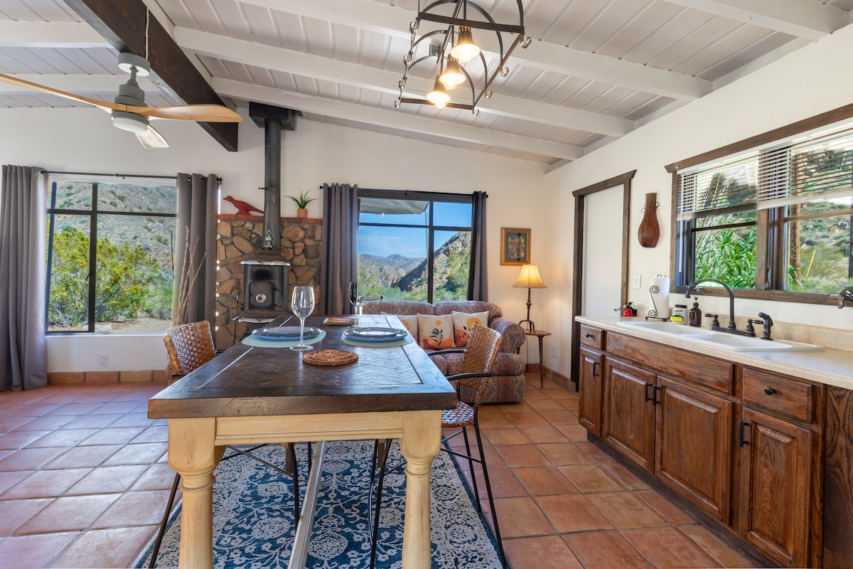 Hot tub under the stars, desert views, and total privacy. This authentic homestead cabin sits on 2.5 acres in Yucca Valley, just 20 minutes from Joshua Tree National Park. Relax in the hot tub, enjoy vinyl records and instruments, or gather for backyard BBQs beneath incredible night skies. With OHV access nearby, a fully stocked kitchen, and bright airy interiors, this retreat blends rustic desert charm with modern comfort.