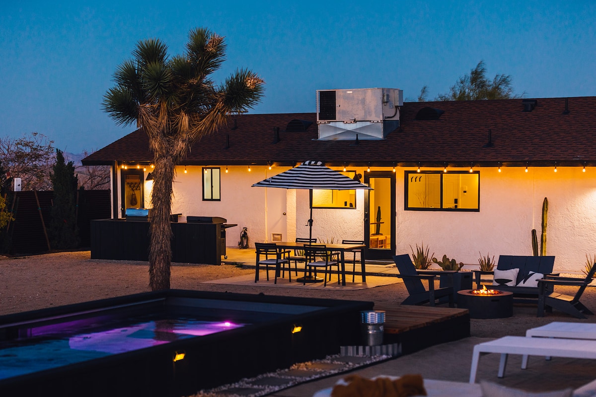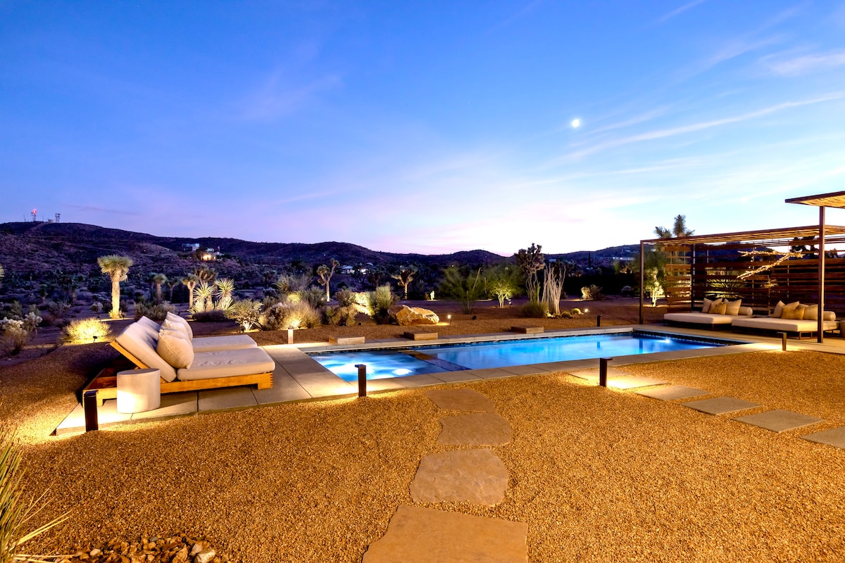 Welcome to "Eternal Sun", a modern, activity-packed masterpiece dropped just outside of Joshua Tree National Park. This home has desert views for days, and will impress even the harshest of critics. Truly an experiential stay with activities to do around every corner. You and your group will have the opportunity to stargaze from our heated pool with expansive desert views, play pool & ping pong outdoors, watch a movie in an outdoor theater, and take a soak in the hot tub under the milky way.