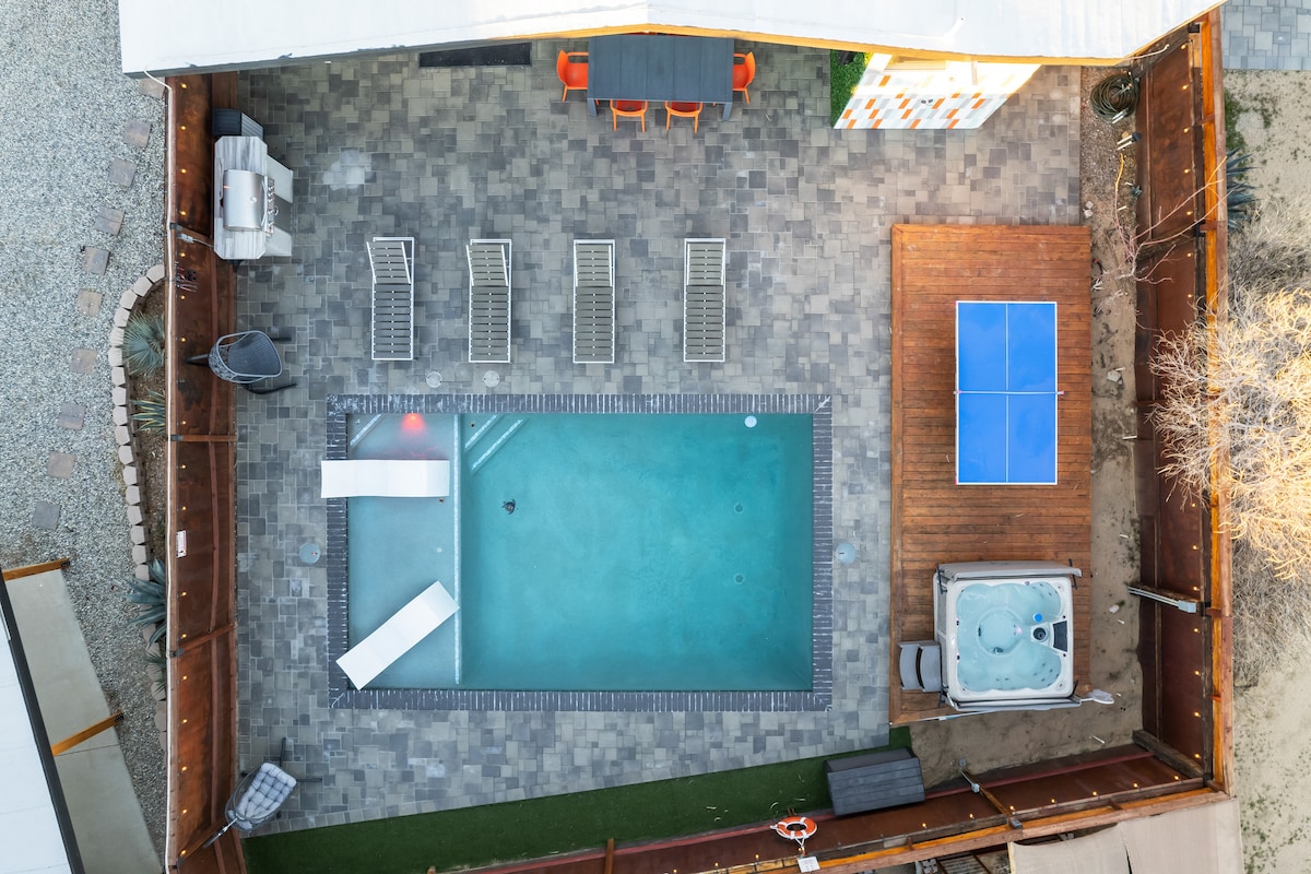 Welcome to Sunset Sage ~ an inspired desert retreat personally designed, built, and styled by a true artist. Every detail, from the layout to the artwork, reflects a labor of love and creative vision. Soak under the stars in the hot tub, cozy up by the fire pit, or curl up with a book in a hammock. Whether you're stargazing with friends or enjoying quiet moments alone, Sunset Sage was made to inspire. Play a round of pool, sip something cold in the sun, and create lasting desert memories.