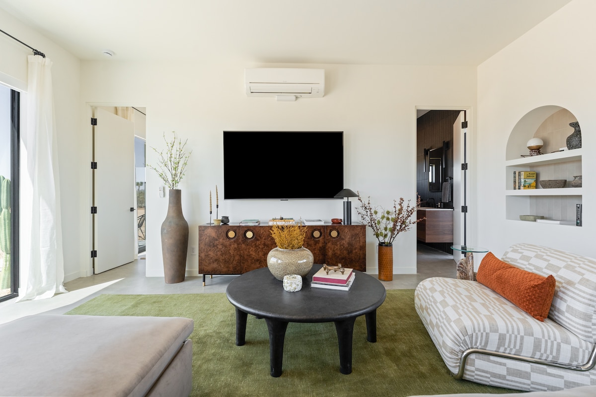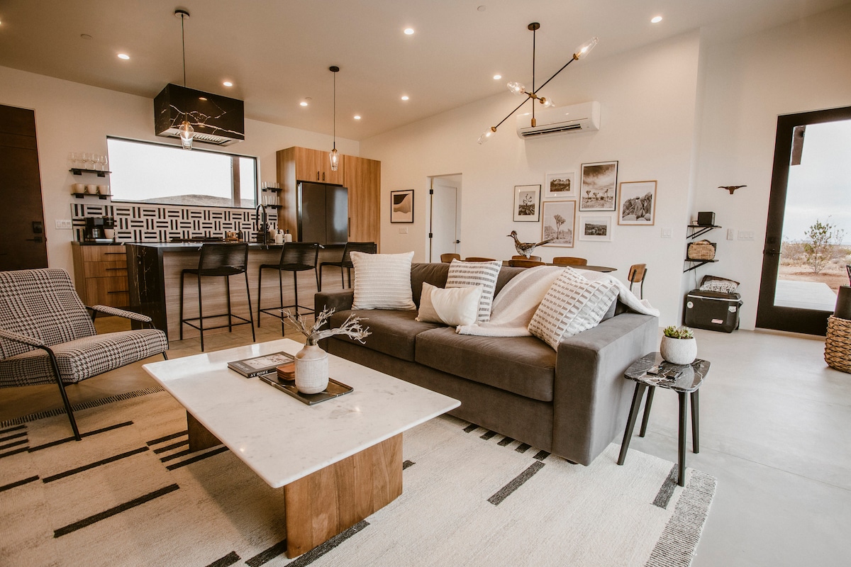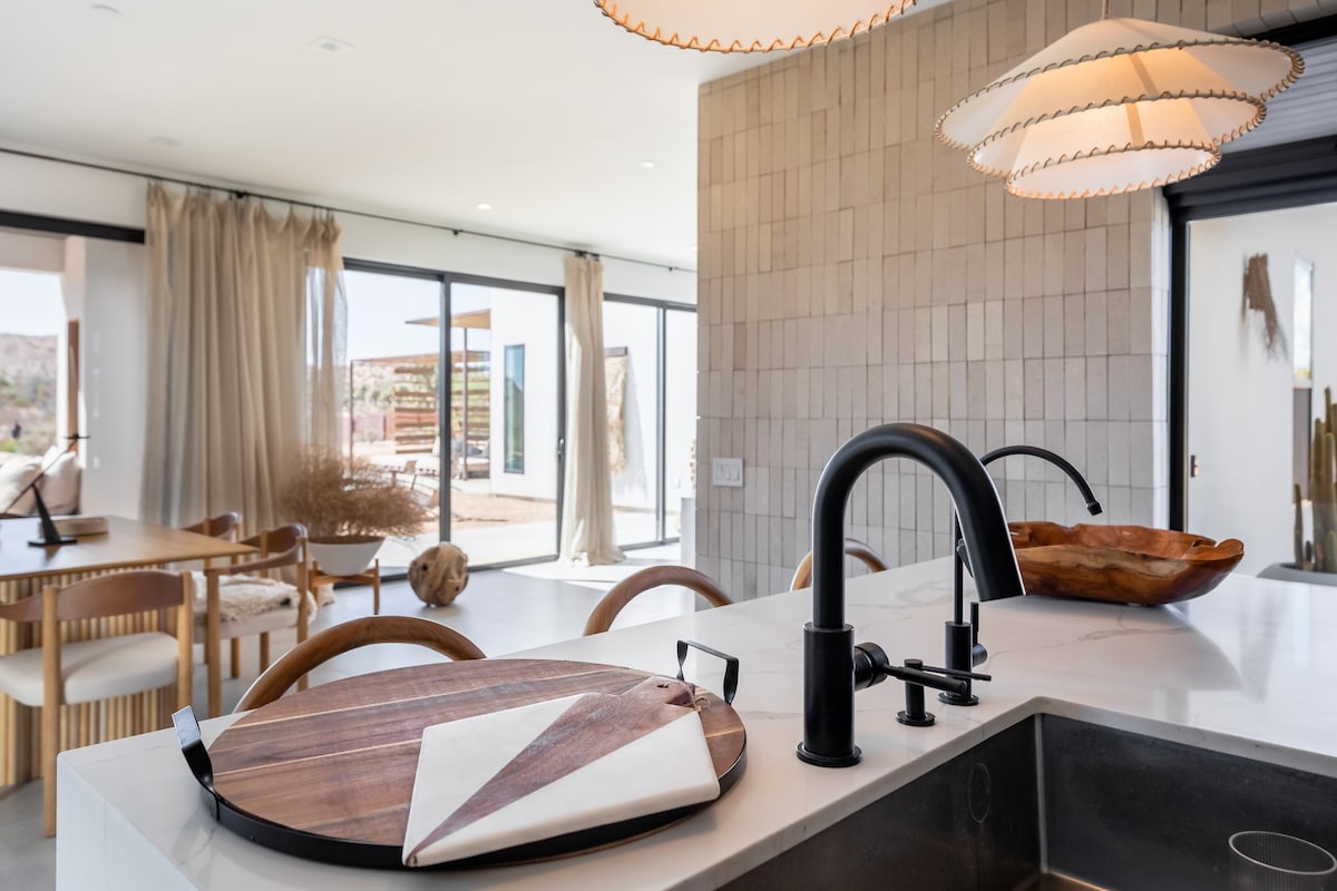 Re-energize in solace under the desert sky in this modern-bohemian dome, featuring many personally designed and handcrafted items. Stimulate your mind and spirit with natural wood and stone elements, and enjoy antique books and games while you take in sprawling mountain views by day and twinkling stars by night. The natural wood burning stove and space heaters warm the home on chilly evenings, and ample AC keeps the dome cool on hot desert days.