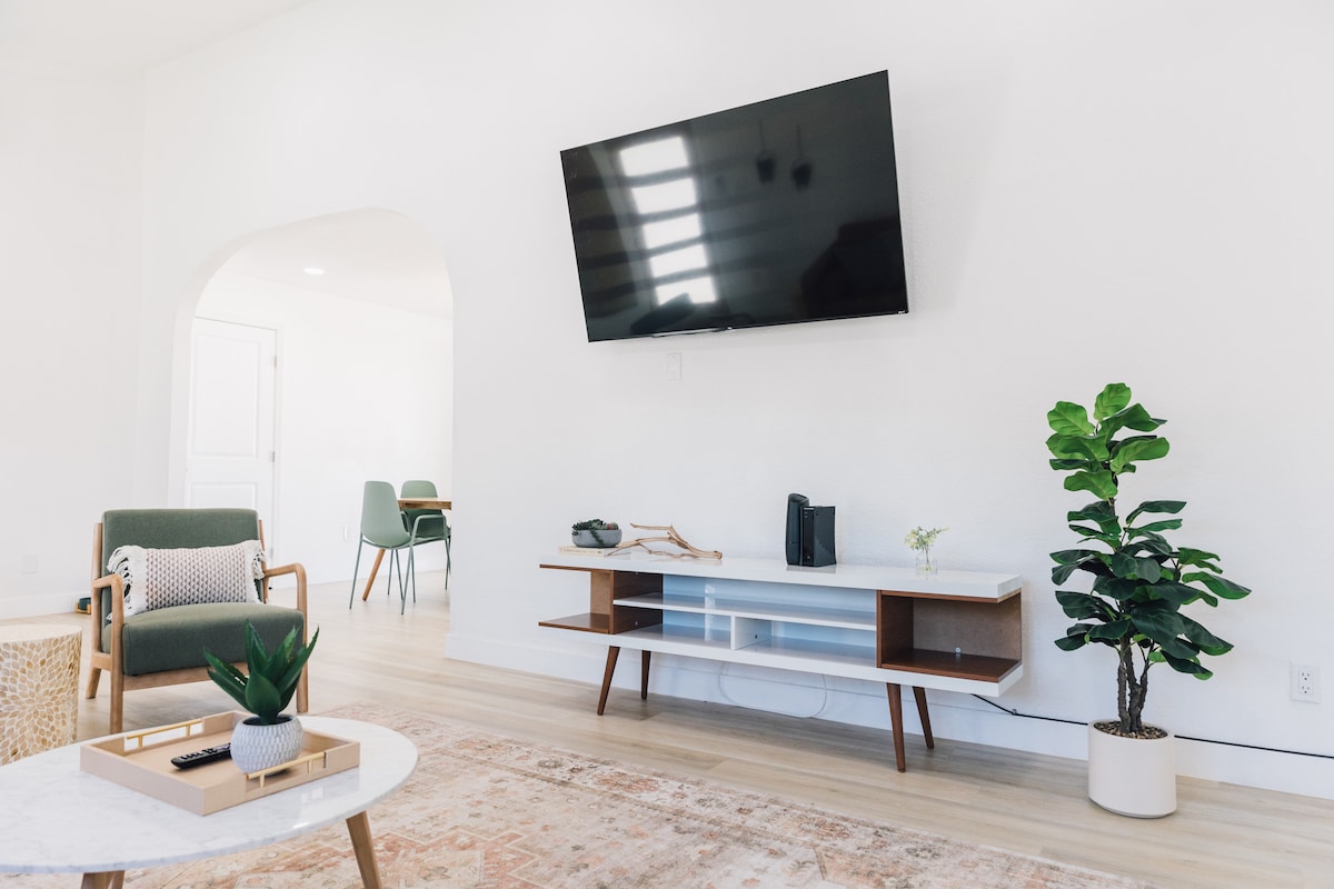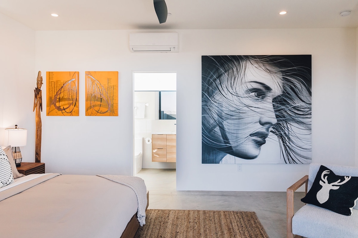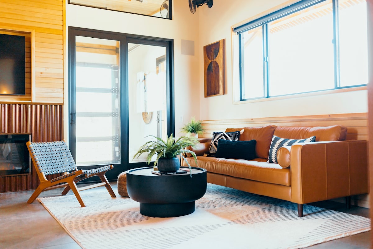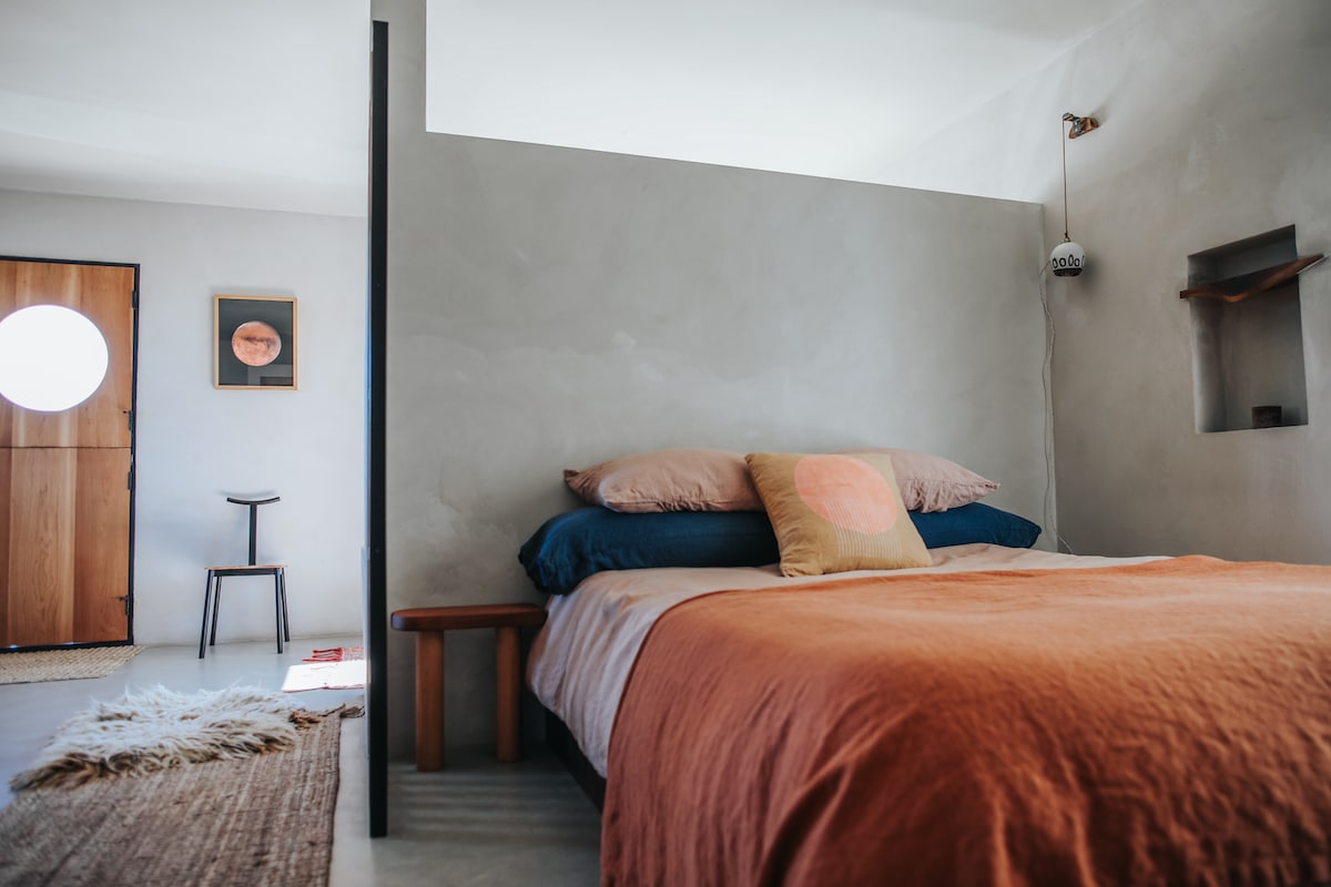 Re-energize in solace under the desert sky in this modern-bohemian dome, featuring many personally designed and handcrafted items. Stimulate your mind and spirit with natural wood and stone elements, and enjoy antique books and games while you take in sprawling mountain views by day and twinkling stars by night. The natural wood burning stove and space heaters warm the home on chilly evenings, and ample AC keeps the dome cool on hot desert days.