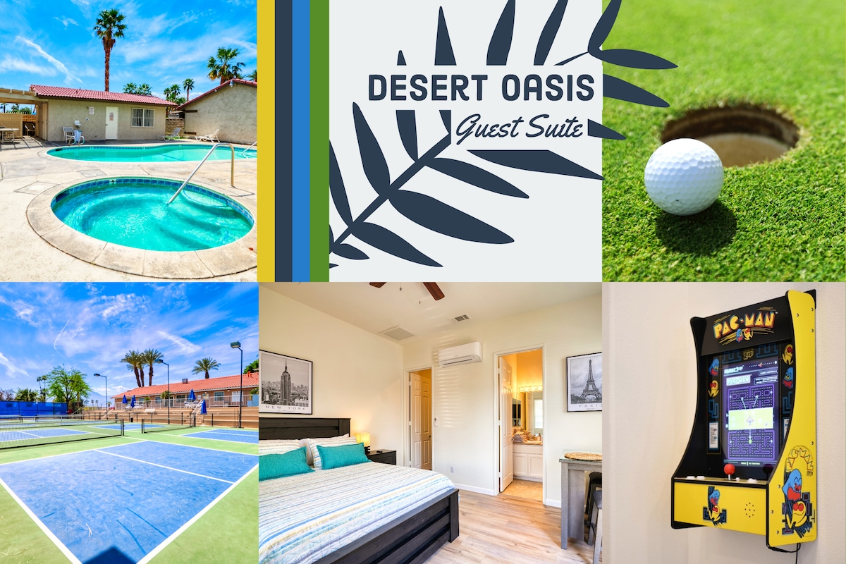 Cozy Studio with private entrance & patio, pool & spa, golf all around, 8min - Tennis Gardens, 12min - Acrisure, win win location! In the heart of a city, but in a quiet neighborhood with plenty of street parking. 10min walk: Albertson's, TraderJoe’s, gas station, dry cleaners, hair & nail salons & few restaurants. Quick drive: Upscale shops, art galleries, restaurants & bars on El Paseo, Acresure Arena, McCollum Theater, Tennis Gardens, Golf, Chella, Stagecoach, Living Desert Zoo, Casino