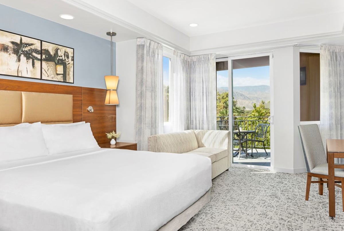 Relax under the warm Palm Springs sunshine at The Plaza Resort and Spa. This Palm Springs vacation resort is near the lush green fairways of the Tahquitz Creek Golf Course and is the perfect retreat for a leisurely family vacation or romantic weekend getaway. In this spacious studio suite you will enjoy one queen bed and one sleeper sofa in the living room. Additional amenities include a kitchenette and a balcony. Maximum occupancy is four. Private sleeping area sleeps two.