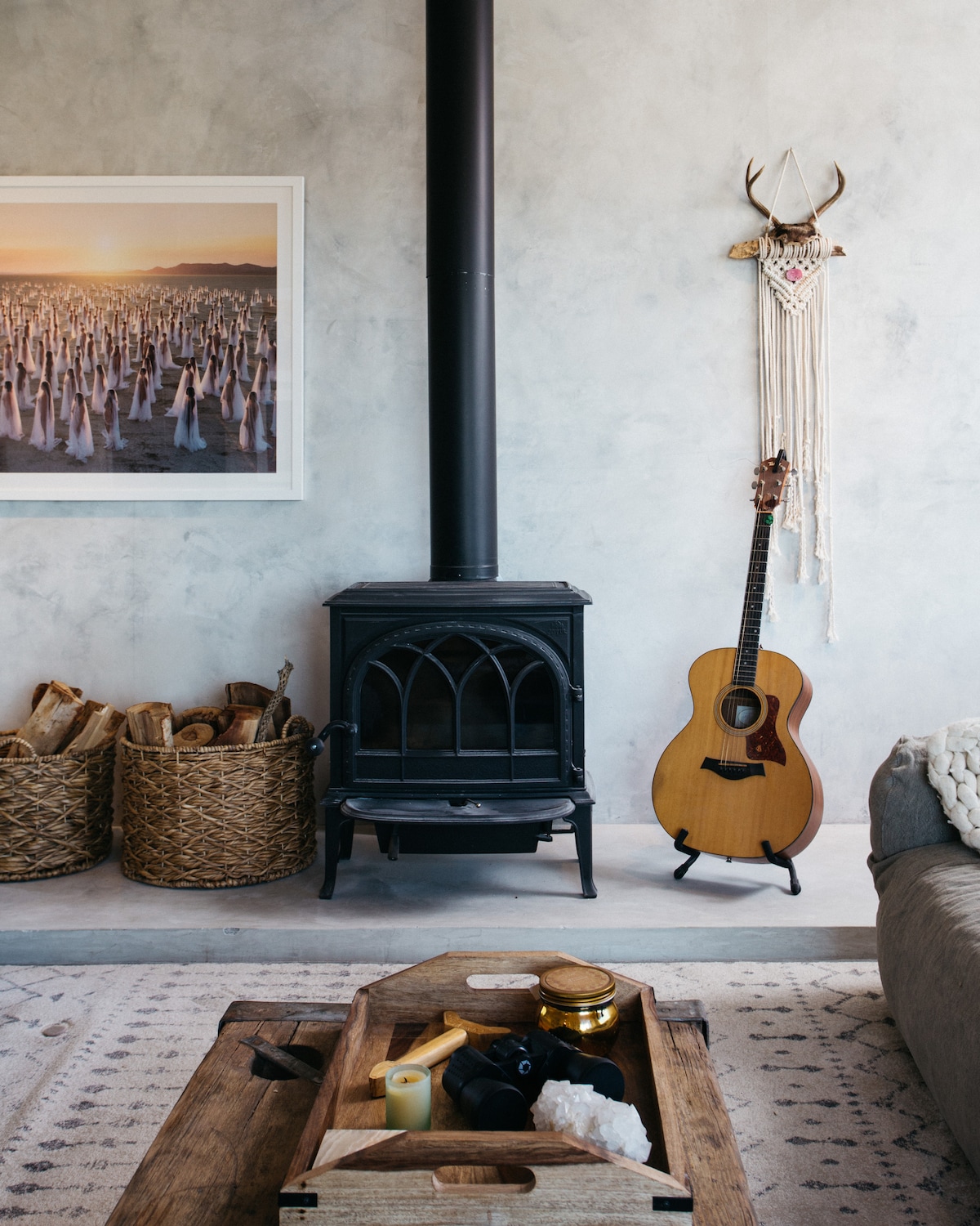 Welcome to a sanctuary for reflection, creativity, and stillness. This thoughtfully curated hideaway features a large soaking tub and access to the stunning shared pool and hot tub at High Desert Protocol. Set two miles up a quiet dirt road, this ever-evolving 6-acre desert compound borders public land—offering a rare sense of vastness, privacy, and possibility, perfect for seclusion and connection. (Interested in a full buyout? The entire property sleeps 16 guests. Inquire for details.)
