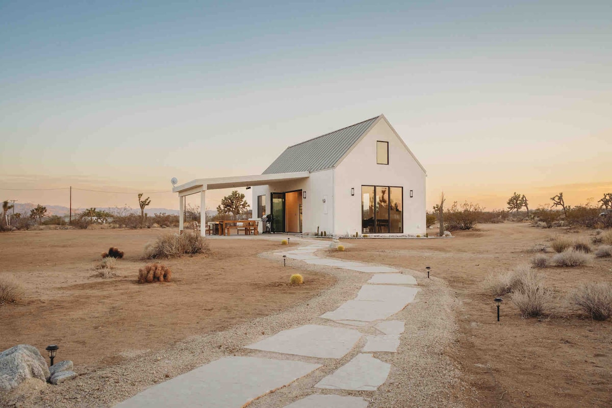 Welcome to the spacious, sun-filled oasis with 360-views of mountain+desert vistas. ->2000 sqft of living space - 10 mins from West entrance of JT national Park -5 minutes to JT Village shops+cafes. -Brand new construction -Tranquil, secluded retreat -Starlink 🛰 200mbps -Fully stocked chief's Kitchen -Coffee Bar and Cocktail supplies -Dedicated Yoga+Meditation room -Oversized Spa- heated year around -Tesla EV level 2 charger -Record Player We invite you to unplug and reset @CasaSerranoJTree.