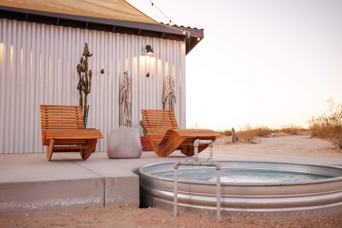 ▪︎ Sleek modern pool with heated spa and tanning shelf ▪︎ Dedicated wellness area with barrel sauna, cold plunge, shower, and Joshua Trees ▪︎ Stunning sunset and sunrise views with extensive outdoor seating areas featuring a fire sculpture All of our amenities are thoughtfully integrated into five private acres in the Joshua Tree area, offering uninterrupted desert views, exceptional night skies, and a rare sense of space and privacy, with a short drive to town and Joshua Tree National Park.