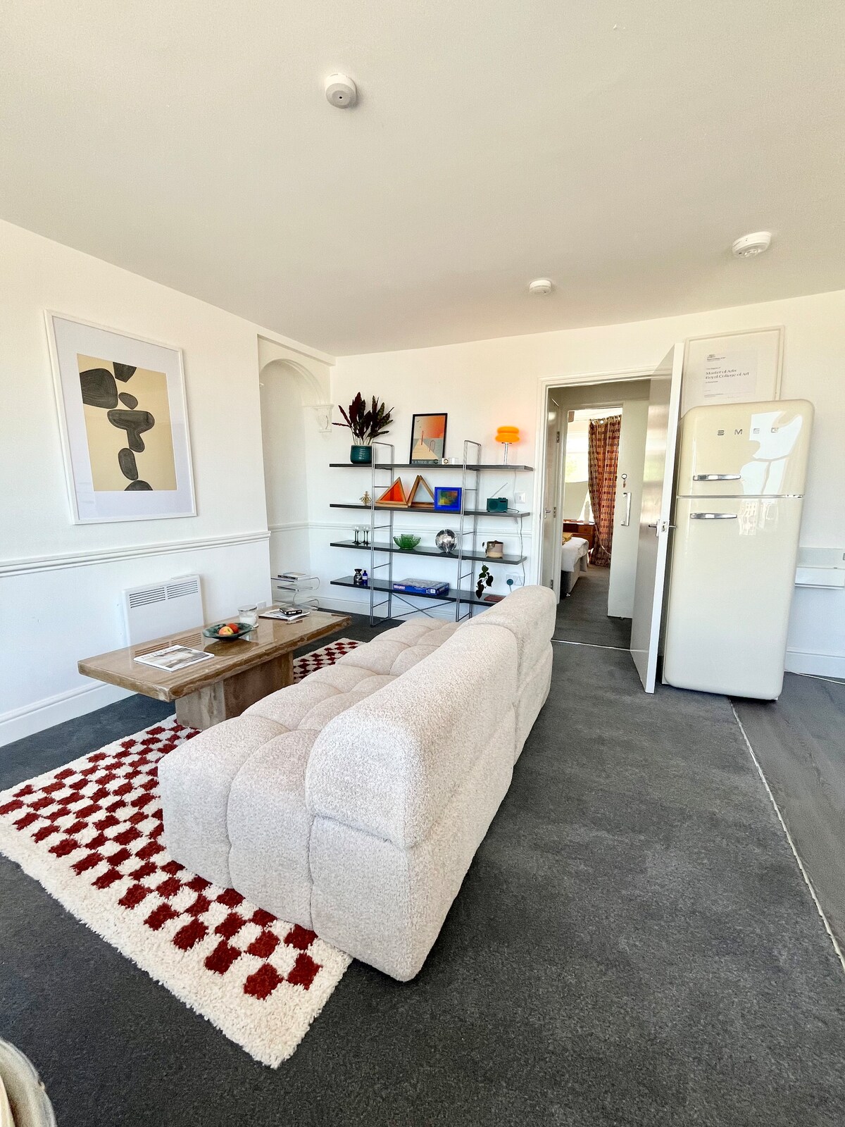 A beautiful, light and airy flat with sea views from every room. The whole flat has been recently renovated with 9 refurbished sash windows. Facing East to West it boasts both sunrise and sunset views over the sea on either side of the building. From the kitchen, bathroom and second bedroom you can see the iconic orange Lido tower and out to Walpole Bay pool. From the main bedroom and living room you can track the tide by day and enjoy Margate’s spectacular sunsets with a drink every evening.