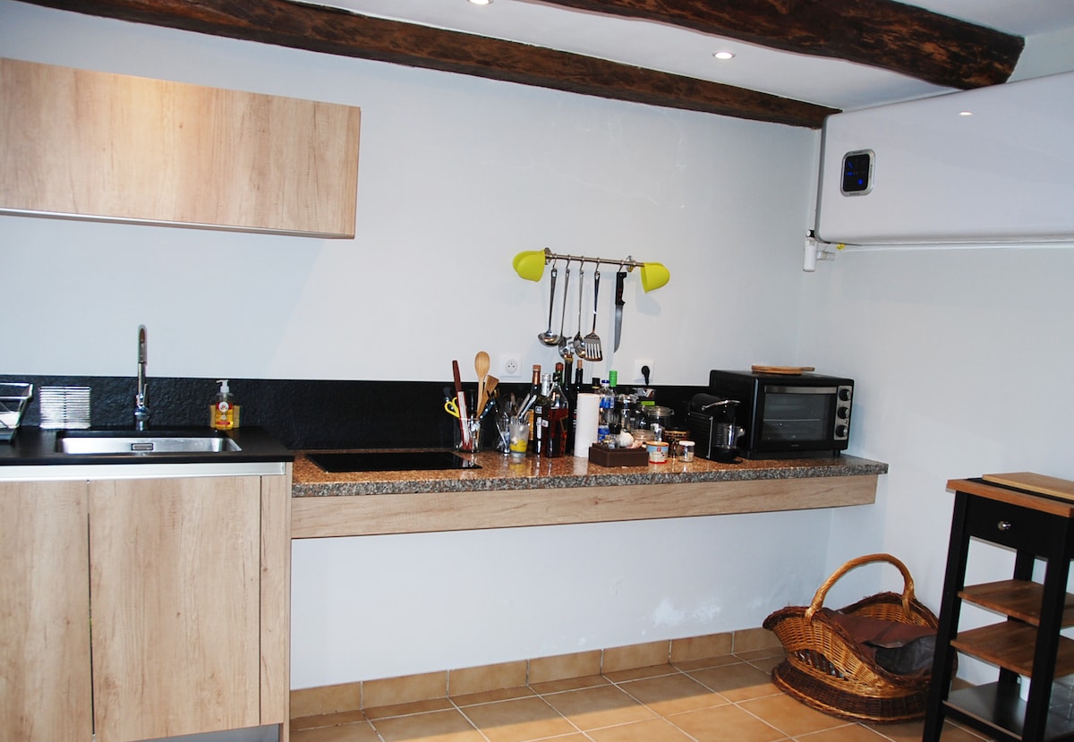Petite maison proche sortie autoroute, attenante à ma propriété à 2 kms de Chatel-guyon dans un petit village d'Auvergne, à l étage 2 chambres avec dressing . Au rez-de-chaussée cuisine ouverte sur salon canapé convertible clic-clac, salle de bain, terrasse. Sauna 10eu les 30 min jusqu'à 4 prs. Piscine 2 h pour les voyageurs d 1 nuit et 4 h au delà d 1 nuit horaires a definir a votre arrivée. Située à environ 30 min de Clermont fd ,40min de Vichy.