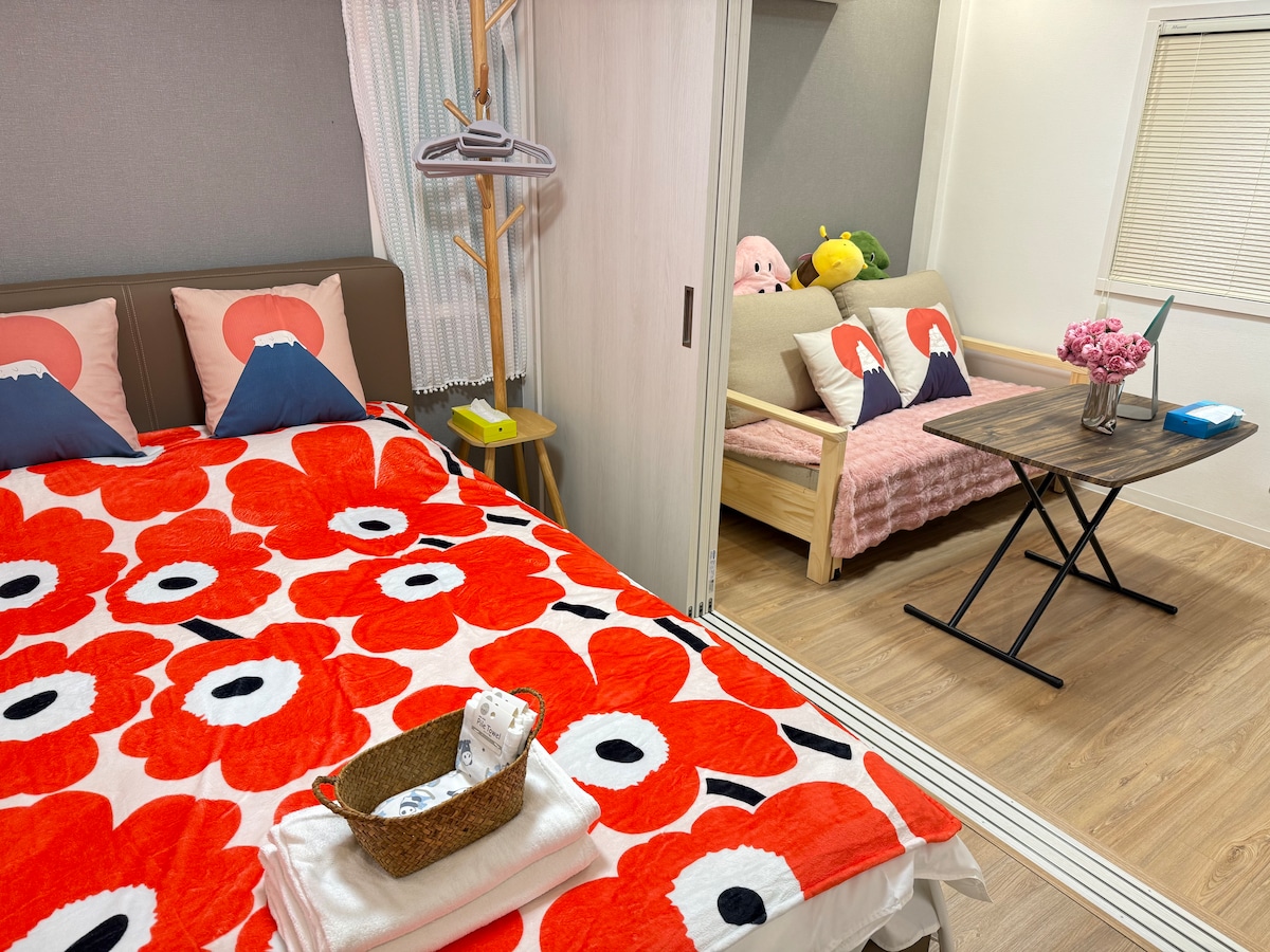 An apartment located in a very convenient location. There are two stations nearby. 6 min walk to the nearest station Yoyogi-Koen station, where you can go to Harajuku in 2 min by train, and 9 min walk to the Sangubashi station, where you can go to Shinjuku station in 4 min by train. Provides FREE high speed internet & Wi-fi. This apartment is self-check-in. There are 2 single sized beds, and 1 double sized bed in the two bedrooms.