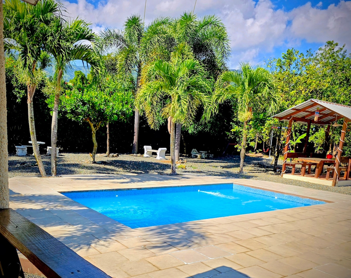 Hermosa y acogedora villa familiar al pie de las montañas de Los Mogotes, donde el cantar de las aves y el sonido del rio te llenaran de paz. Ideal para compartir con la familia y amigos. Disfruta de la excelente vista a las montañas desde la piscina, o de un bello atardecer desde el jardin. A poco tiempo de Santo Domingo, apenas 20 Min del peaje te puedes encontrar con un paraiso natural encantador.