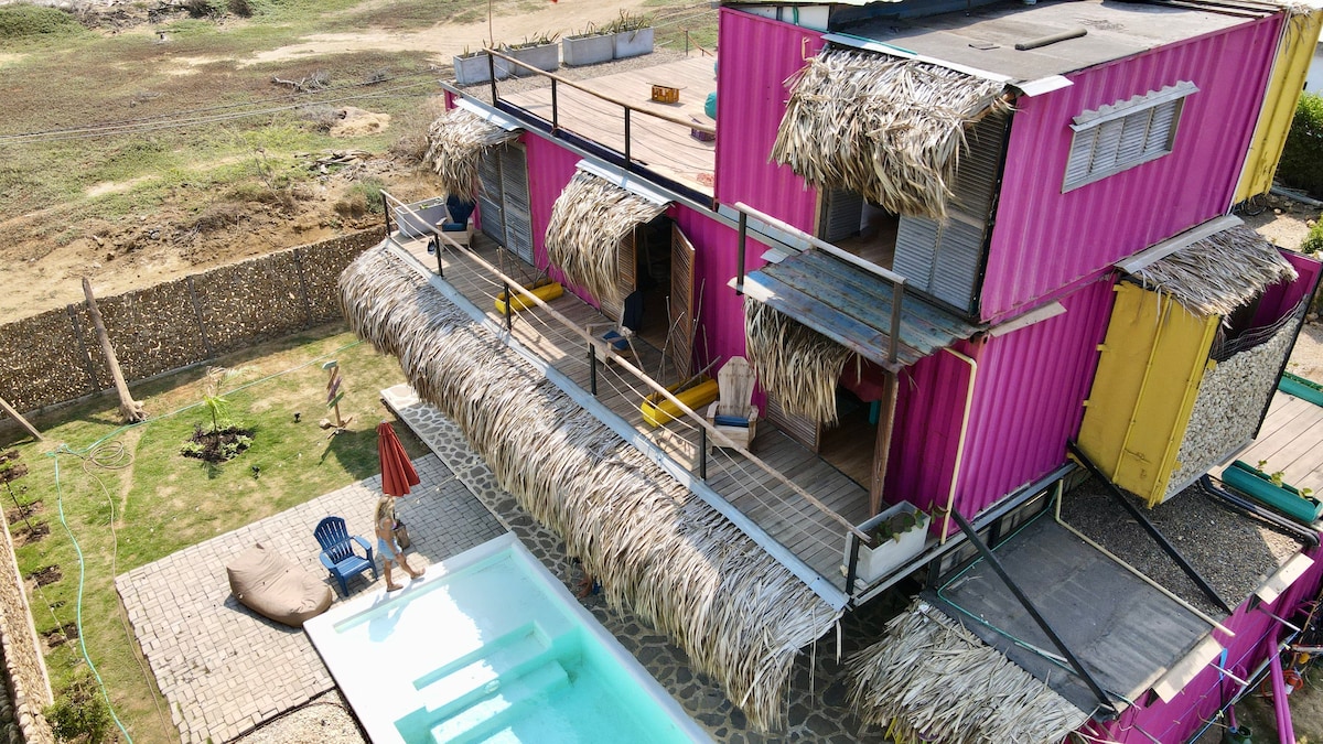 Stunning villa in Salinas del Rey! Private pool, rooftop views, workspace for nomads, and epic Caribbean vibes. Perfect for families, groups & kitesurfers. Relax, work, or ride the wind—this place does it all. Hot water is available during the day for your comfort. We have 7 double beds and two hammocks. Whether you’re here to relax, celebrate or work remotely by the sea, this house is your ideal base in Colombia’s hidden coastal gem.
