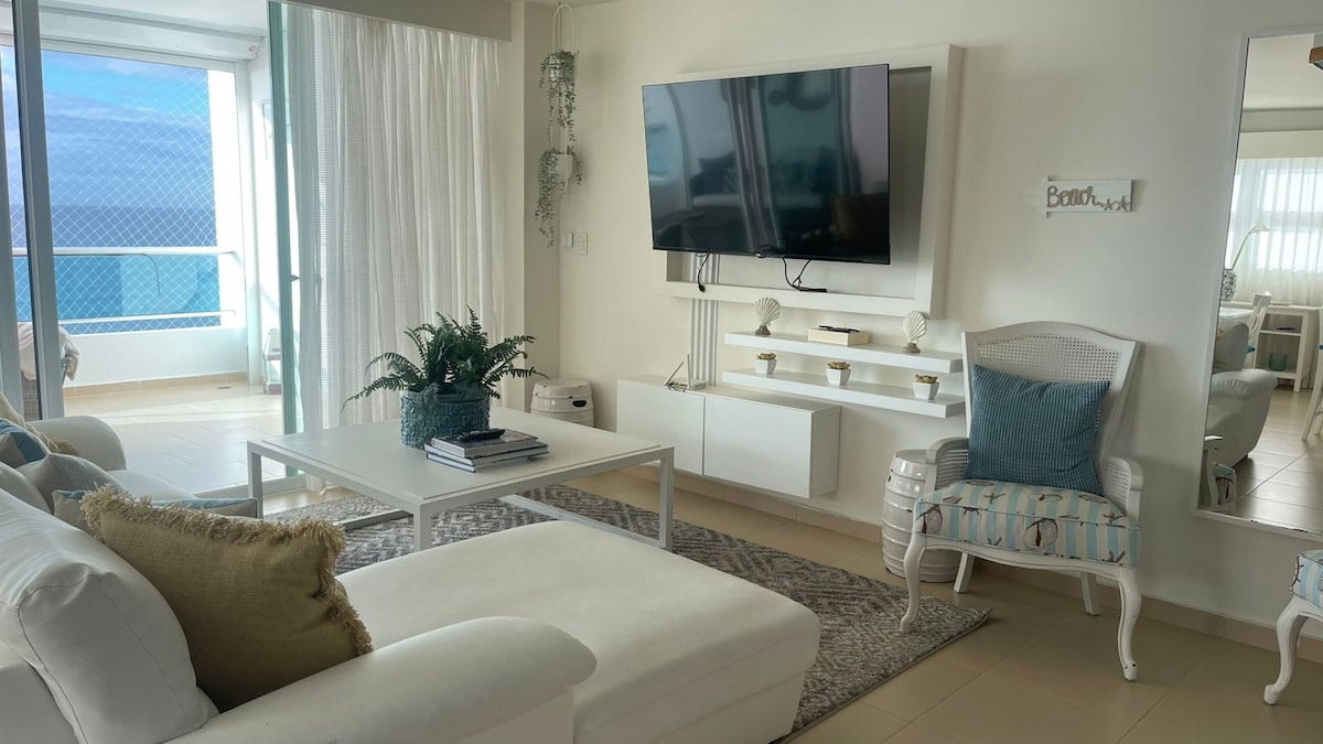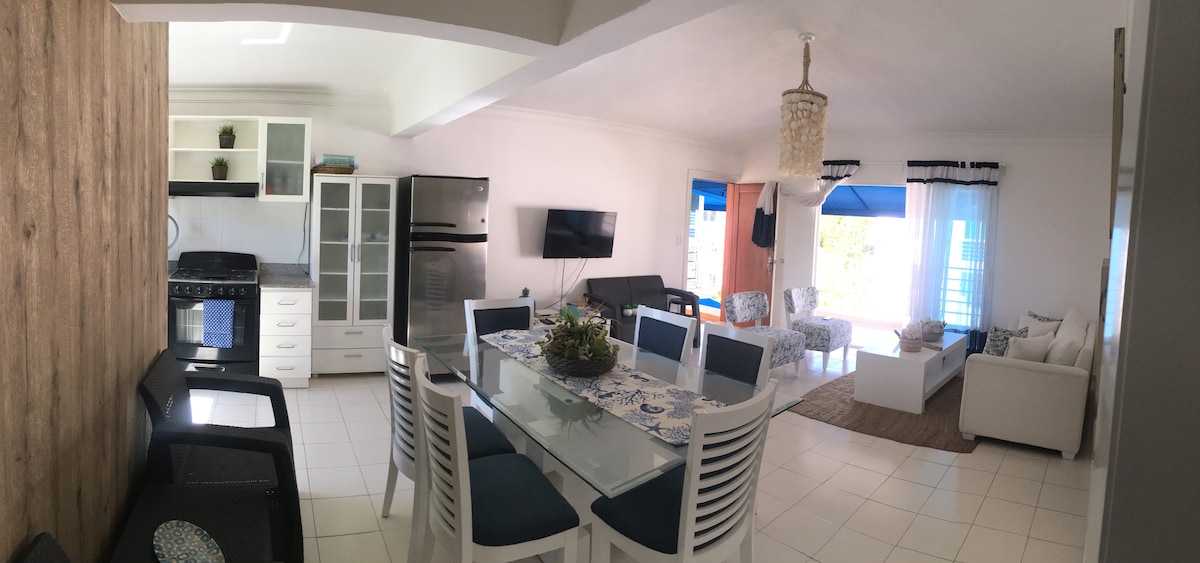 Hermoso y espacioso apartamento de 2 habitaciones completamente equipado para brindarle la mejor experiencia en Juan Dolio, cuenta con una sala acogedora con mueble amplio espectacular y televisión de 75" con equipo de sonido para disfrutar como una sala de cine de tus películas y series favoritas. También cuenta con colchones de alta gama versión americana que te garantizaran un buen descanso. Se encuentra de la playa a 2 minutos caminando. Tenemos una variedad de 8 juegos de mesas.