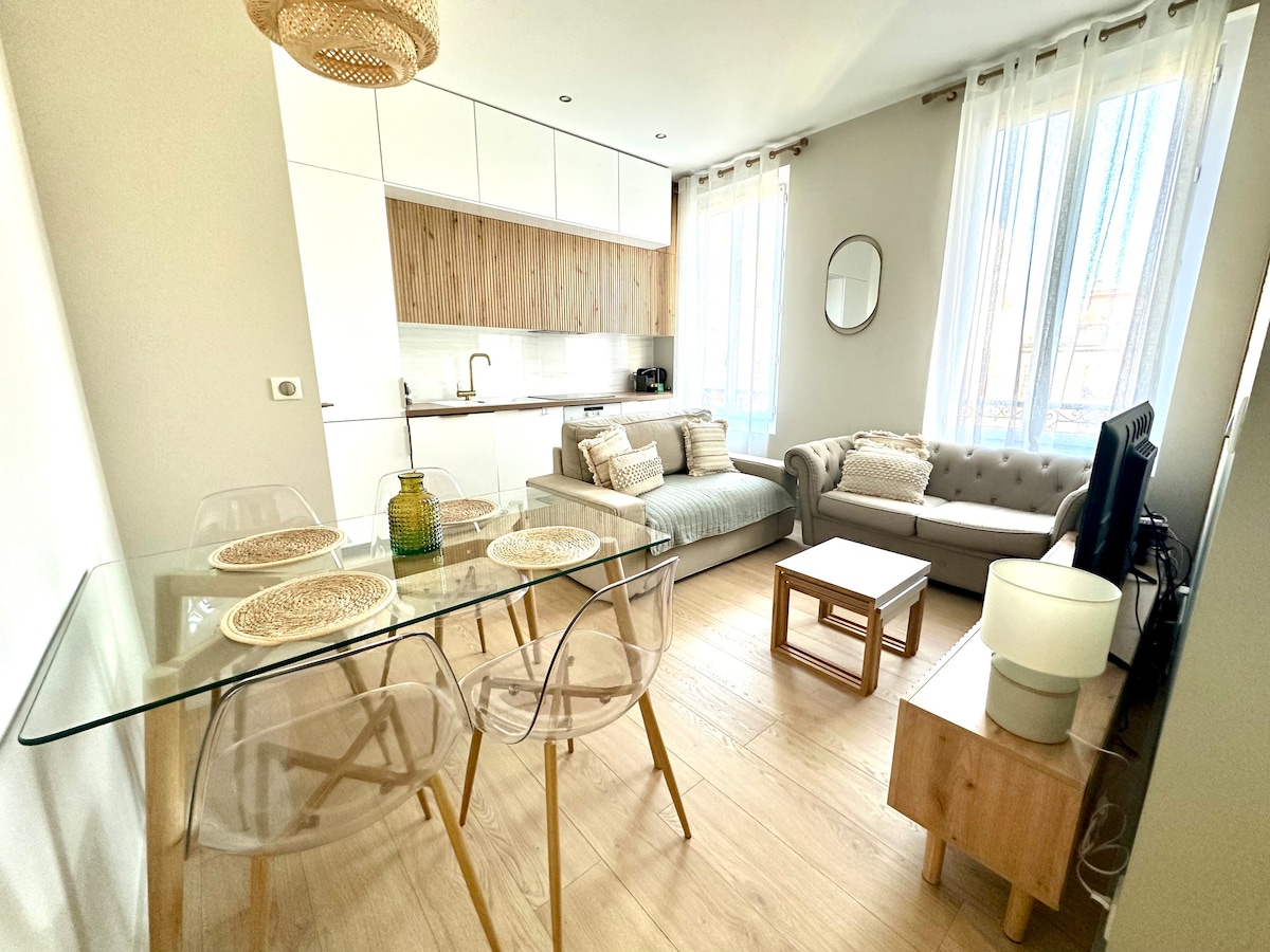 "This is exactly the place to be" Art Deco building. Apartment refurbished center Juan-les-Pins Sea view. In angle/Triple exposure and bright. At 1 min from the beach, summer activities and shops. At 5 min from the station. 1st floor (no elevator). 6 pers, 2 bedrooms, cupboards, living room with sofa bed (140x200). Equipped kitchen, oven, plate, refrigerator/cong, microwave Bathroom with shower and toilet + Washing machine and dryer. Wifi / TV / air conditioning. Possibility of parking.