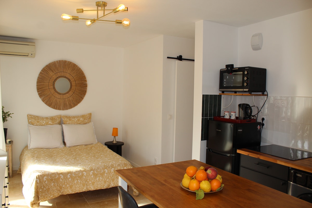 Très beau studio de 25m2 avec balcon entièrement rénové, son séjour comporte le lit, sa TV HD, ses nombreux rangements ainsi que sa cuisine ouverte entièrement équipée (plaque de cuisson, réfrigérateur-congélateur, four combiné, lave-linge), son îlot central pour prendre vos repas ou à utiliser comme bureau, son Balcon aménagé pour prendre son petit déjeuner ou ses repas. Au Cannet, proche de toutes les commodités (Bus, Autoroute, Restaurants, Boulangerie, Supermarché, Pharmacie... )