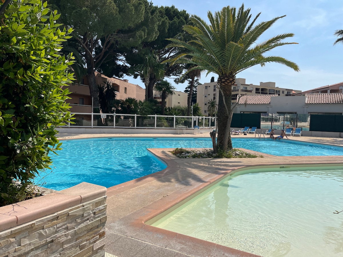 ***Studio refait à neuf*** RDC, capacité max 4 pers 29 m² (2 couchages en coin nuit (pas de chambre séparée) et 2 couchages en canapé convertible) Place de parking privée au sein de la résidence Terrasse vue arborée 17 m² avec sa cuisine d été (frigo/plancha) Cadre exceptionnel, Résidence Royal Palm Haut Standing Résidence face à la mer à 10 m des plages et piscine dans la résidence Le logement est situé sur la promenade #boccacabana