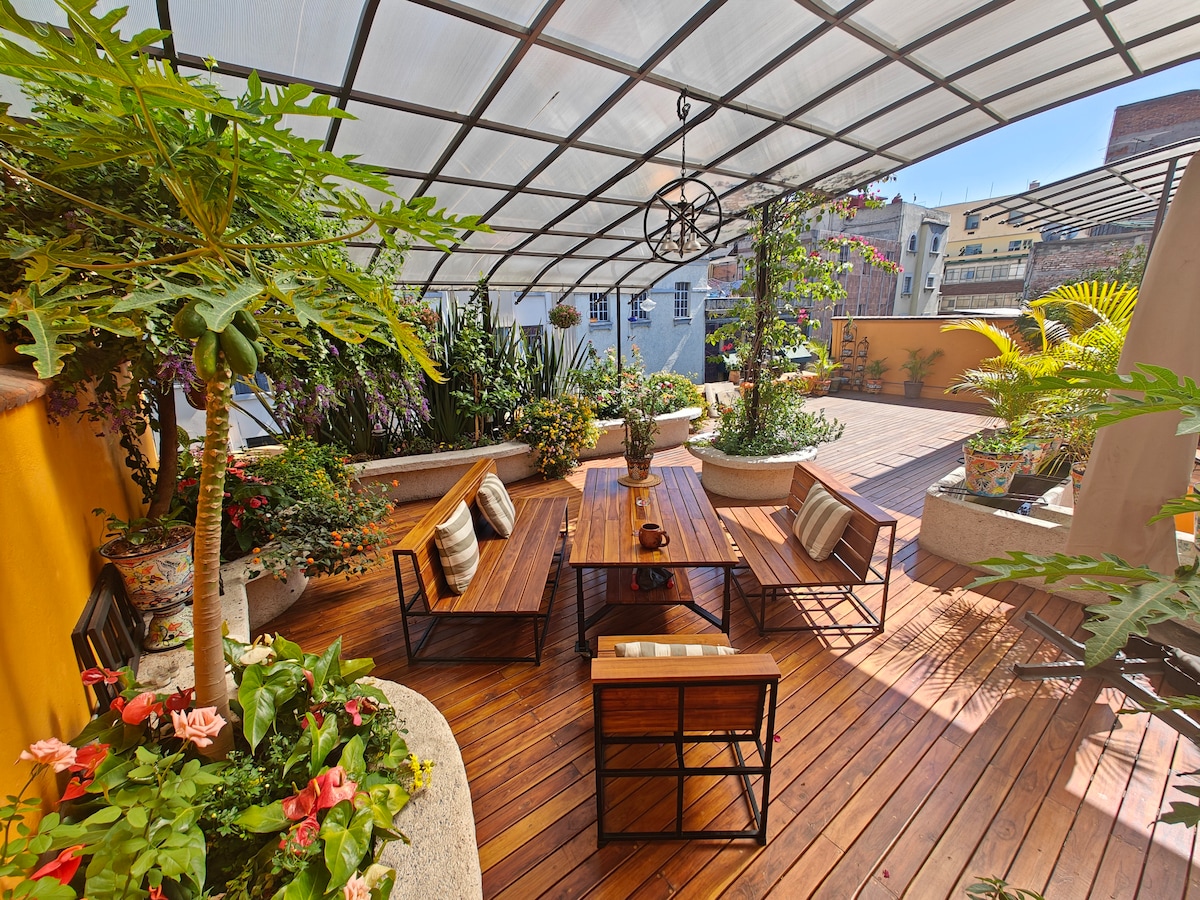 Unique rooftop apartment in the heart of Mexico City, in Condesa neighborhood. Close to 3 parks, & the vibrant restaurant area. The apartment is on a quiet street, at the top of a 3 storey building, It’s a walk-up. Full of light, and with great views on both sides of the property. The bedroom and the bathroom are tiny, but the kitchen and living room that extends into the terrace are very spacious.