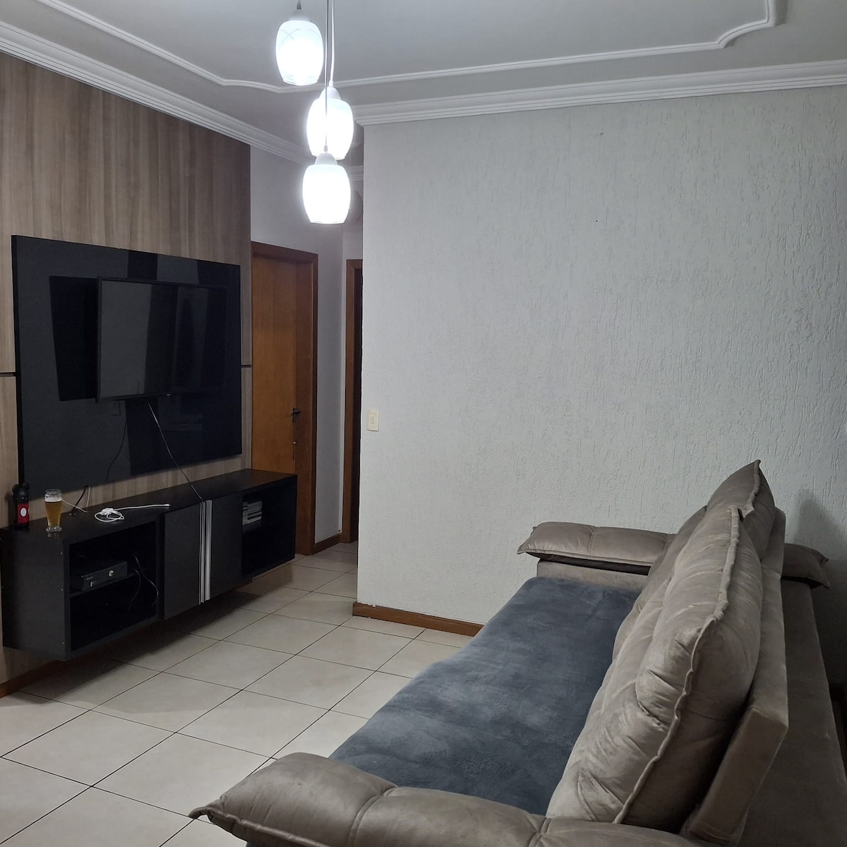 Perfeito para casais, famílias pequenas ou viajantes que buscam espaço agradável. Possui 2 quartos (um com uma cama de casal e outro com duas camas de solteiro), 1 banheiro, área de serviço com maquina de lavar , sala espaçosa , cozinha moderna já equipada com geladeira, fogão e airfryer, para que você possa preparar suas refeições de forma prática e cobertura com churrasqueira e 1 vaga de garagem. Proximidades: supermercados, shopping, hospital e faculdade a poucos minutos de carro.