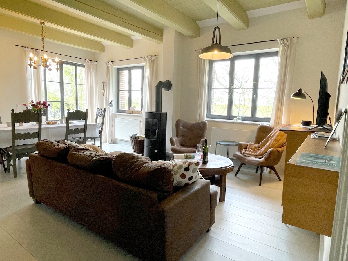 Die ebenerdige Wohnung mit Terrasse ist nach Westen und Norden hin ausgerichtet mit Ausblick in die umliegenden Felder. Die Schlafkammern, das Duschbad sowie das separate WC befinden sich im hinteren Teil der Wohnung und sind über einen Flur vom Wohnraum separiert. Der ca. 33 m² große Wohnraum mit Küchenzeile und Eßtisch hat eine Deckenhöhe von rund 2,9 m. Die gemütliche Sofaecke ist der ideale Ort zum Entspannen und ein Kaminofen sorgt für Behaglichkeit.