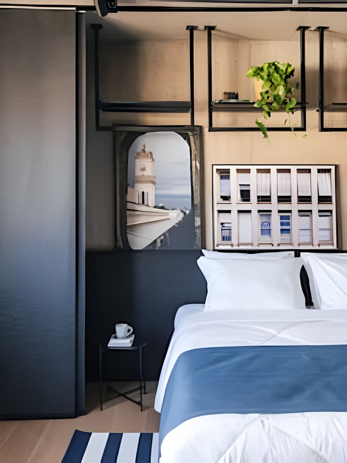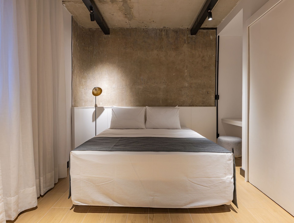 Nesta unidade, uma solução de fácil adaptação permite que o hóspede crie e recrie sua espacialidade. Estruturas suspensas, araras, feitas em serralheria e todo o restante do mobiliário permitem a livre movimentação. O fechamento, ou não, dessas estruturas é feito com persiana do tipo painel.