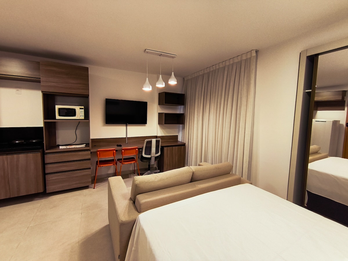 Apartamento tipo Studio novo com todo mobiliário novo e bem planejado de forma a trazer o máximo conforto para os nossos hóspedes. Andar alto,muito bem localizado com tudo próximo , em plena Av Itamar Franco, 915,quase esquina com Av. Br. Rio Branco no coração da cidade! Ideal para seu home office aliado ao lazer! Com uma área de lazer completa com piscina,academia,área gourmet, coworking, espaço kids e lavanderia. Curta uma experiência sem igual neste Studio bem-localizado com ar cond. e lazer!