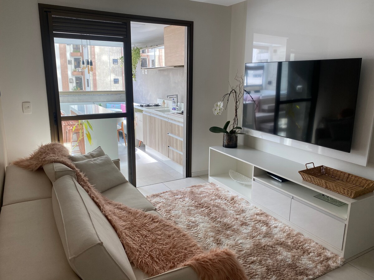 Apartamento Garden no centro da cidade, próximo a mercados, padarias, farmácias, restaurantes, etc. 86m2, dois quartos, dois banheiros, acomoda até 4 pessoas, dois aparelhos de ar condicionado, área de lazer completa, piscina, sauna, jacuzzi, salão gourmet, salão de festas, espaço fitness, garagem, portaria 24h, aceita pet