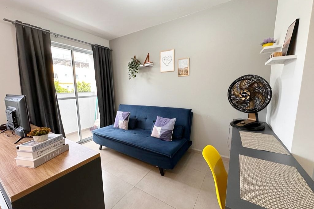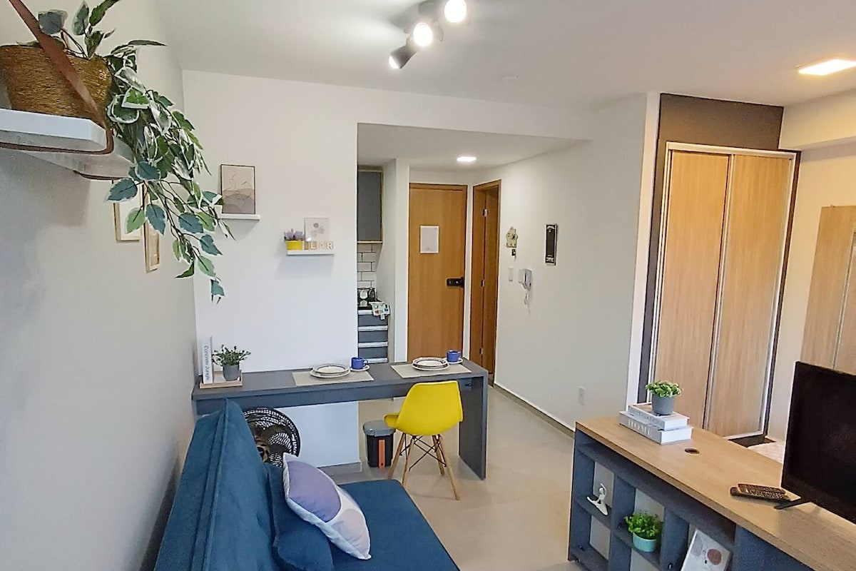 Aproveite esse espaço único e tranquilo. Com 2 quartos com cama de casal, sala com sofá- cama, cozinha com microondas, fogão, forno, geladeira, liquidificador. torradeira e cafeteira. Tv e ventilador. O prédio possui uma linda e completa área de lazer que poderá ser usufluida caso fique uma semana ou mais conosco. Há um mini mercado dentro do condomínio com coisas básicas para consumo (necessário baixar app para utilização). Próximo a ponto de ônibus, táxi, padaria, supermercados e igrejas.