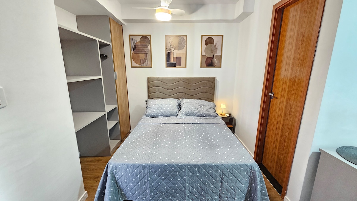 Apartamento super confortável tipo studio com localização imbatível para seus compromissos de trabalho e/ou lazer. ► Cama de casal com colchão de molas; ► Smart Tv 40” (incluso Netflix, Prime Video, Disney+ e Globoplay); ► Ar-condicionado; ► Ventilador turbo; ► Persiana tipo blackout; ► Roupeiro com cabides; ► Caixinha de som bluetooth; ► Mesa de estudos/trabalho com luminária; ► Sofá-cama para casal; ► Mesa para alimentação; ► Cozinha equipada para preparar pequenas refeições.