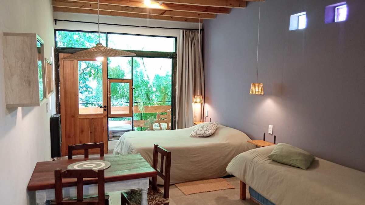 Este alojamiento único tiene mucho espacio para que disfrutes con tu grupo. ¡Con capacidad para hasta 5 pers! Con aproximadamente 110 m2,con el máximo confort y espacio. 2 habitaciones, una doble y una triple, con calefacción eléctrica en c/u. 2 baños, 1 completo-1 toilette. Cocina completamente equipada y barra desayunador. Amplio living comedor con grandes ventanales y salamandra (provisión de leña NO incluída). Amplia galería con asador y terraza pergolada. Al pie de la Paleta del Pintor.