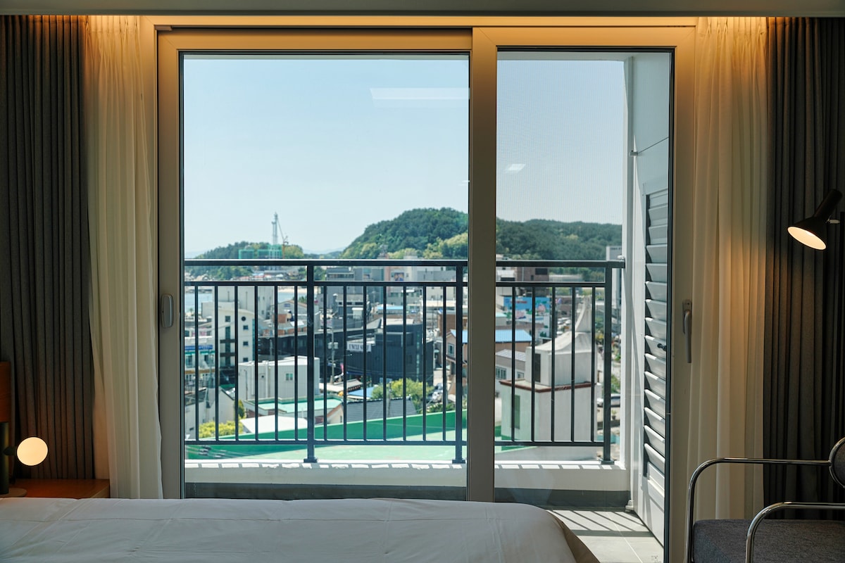 2023 Grand opening, E7 in Jukdo. -One Studio Room (Double bed) -Just in front of Dongsan Beach, 10Sec from the Beach -Check In from PM4:00 -Check Out by AM11:00 -3Min by car from Jukdo Beach, Ingu Beach -15Min by car from Jumunjin Beach, BTS MV location -30Min by car from Kyungpo Beach, Sok-Cho and Seolak Mountain. -Refrigerator, Electric range, Microwave, Dishware, Pot, Frying pan -Shampoo, Hair conditioner, Body shampoo, Tower -Smoking is prohibited in room Thank you:)