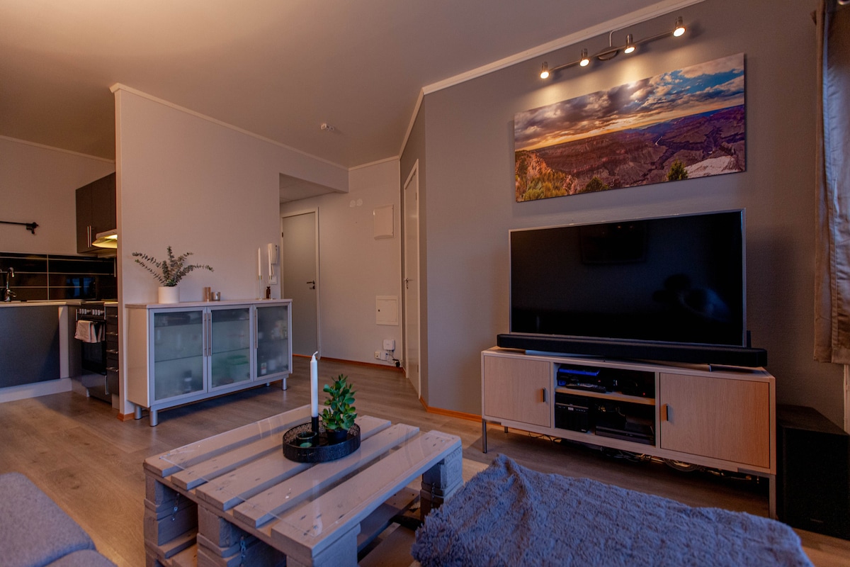 Experience luxury and comfort in this prime location, perfect for couples, families, or friends exploring Tromsø. Short walk to the city center, with a bus stop 300m and a supermarket 200m away. Relax in premium beds with extra sleeping options and enjoy an unparalleled cinema experience on an 85-inch The Frame TV. A unique stay that combines convenience, style, and breathtaking views. Free street parking Customised home office solutions for longer stays!