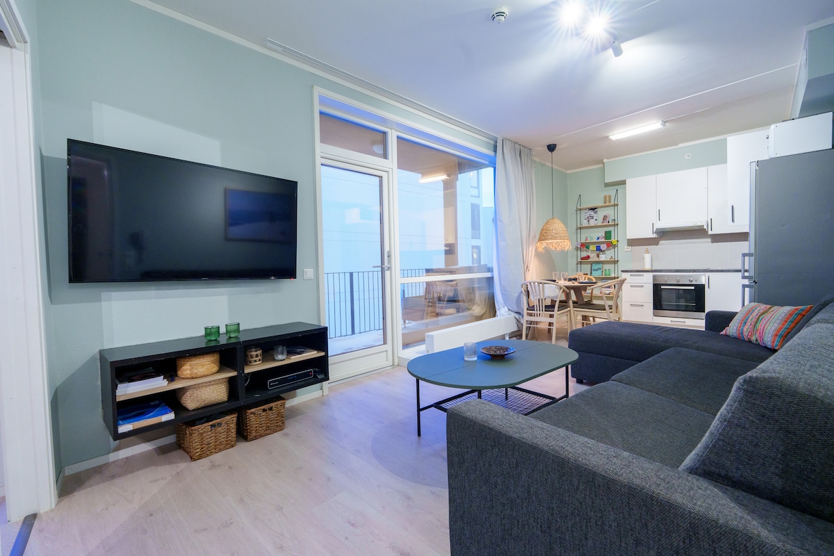 Ultramoderne leilighet med ett soverom i gåavstand til sentrum byen, rett ved strandkanten og med havutsikt og kanskje også aurora utsikt. Soveplass til fire med en hovedseng på 180cm, og en premium sofaseng. Utforsk butikker, restauranter og mer bare noen skritt unna. Utstyrt med kun design møbler. En 65'' 4k OLED high-end TV. Nyt enten utsikten fra balkongen med utsikt over fjellene og havet eller slapp av i sofaen med tilgang til Netflix, Viaplay, HBO Max, Prime, Spotify og Disney
