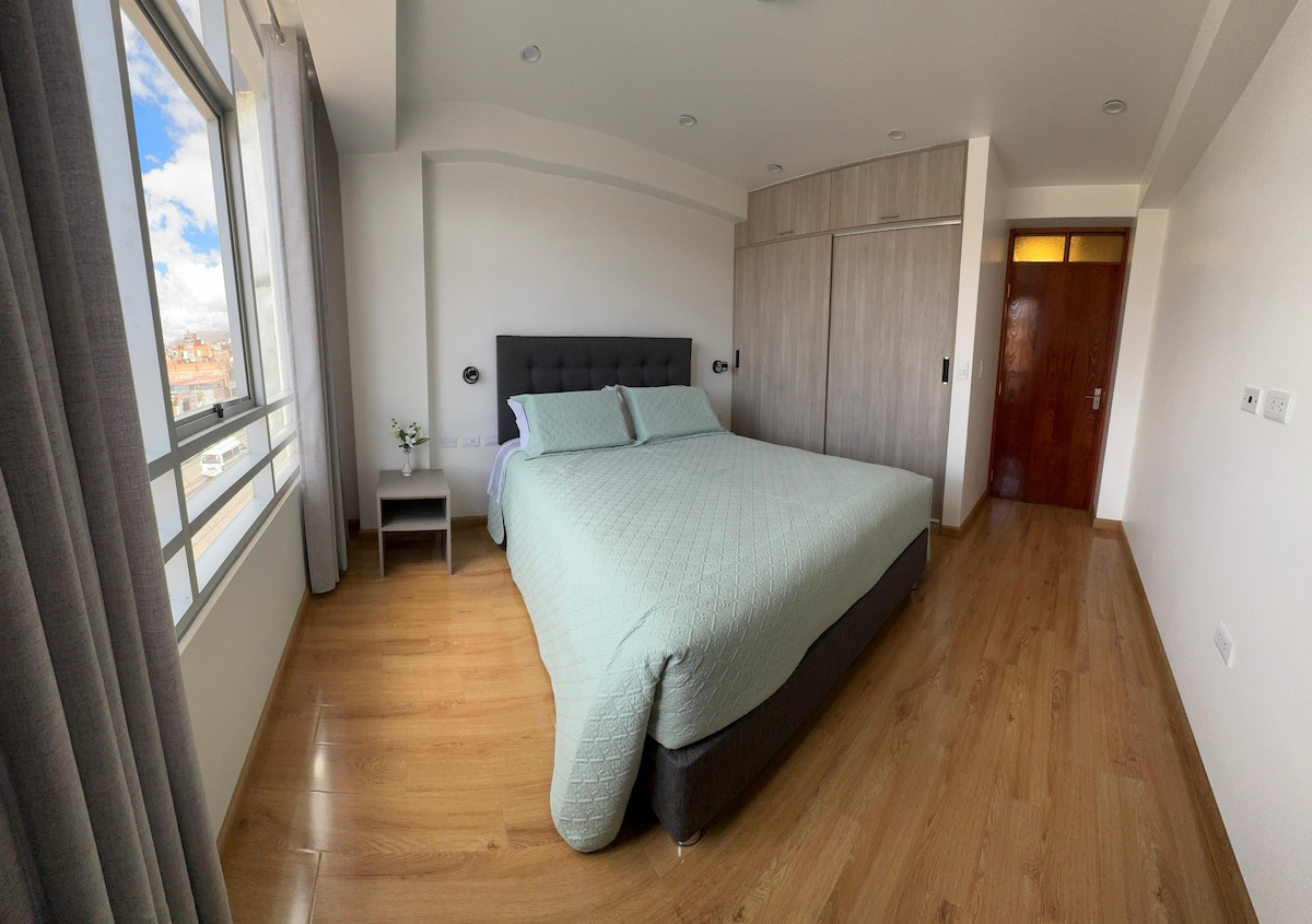 Moderno y tranquilo departamento ubicado en la Zona más Segura del centro de la ciudad de Juliaca, frente a Real Plaza,con todas las comodidades para hacer de su estadía una experiencia cómoda y cálida, en un departamento de 1 habitación con cama Queen y colchón ergonómico de espuma viscoelástica para un mejor descanso, también cuenta con un smart tv de 65" con internet de alta velocidad, 1 sala con vista para apreciar atardeceres, cocina equipada, baño y ducha con agua caliente las 24hrs.