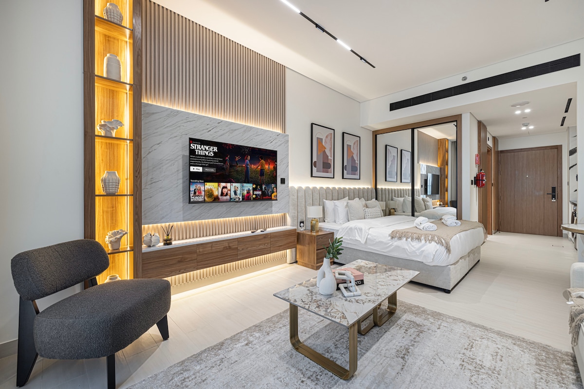 The studio is located in Palm Jumeirah, a famous landmark of Dubai. Grandeur Residences complex has its own private beach and pool 10 meters away from the building and underground parking, everything free of charge. The studio has a very peaceful backyard and a small private garden, where you can relax. Neighboring our residency is a famous 5-star hotel Zabeel Saray with great restaurants, where you have a 30% DISCOUNT on everything.