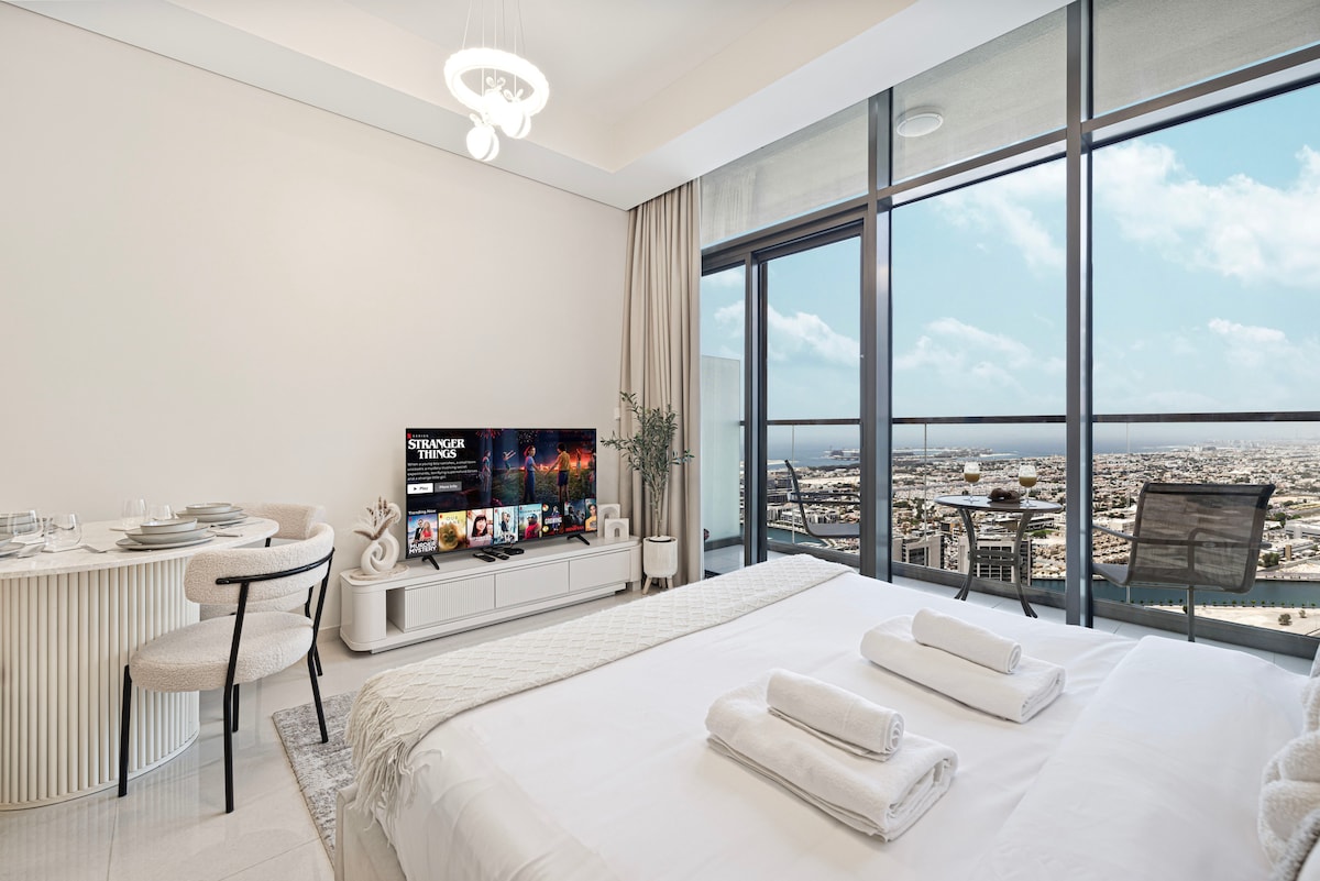 Bright and newly renovated studio apartment in Crescent B Tower, located in the heart of Dubai. Enjoy a comfortable queen size bed, custom-made wardrobe, 4K flat-screen TV, Nespresso machine, and a fully equipped kitchen with dishwasher — perfect for longer stays. Large windows offer stunning views of the Lake. Ultrafast WiFi, 24/7 security, premium amenities, and a welcome kit are all included. Designed for comfort, style, and a flawless stay.