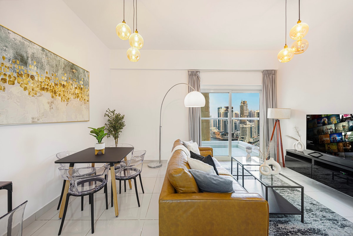 Experience luxury in this uniquely designed 1 bedroom retreat at Sparkle Tower, Dubai Marina ✨. Blending modern glam with industrial chic, this stylish space is perfect for couples or professionals seeking comfort and character. Enjoy breathtaking marina skyline and Ain Dubai views 🌆, plus access to the pool 🏊♂️, gym 💪, sauna, and 24/7 concierge. With a fully equipped kitchen, fast WiFi, and a work friendly setup, you are moments from Marina life and city icons.