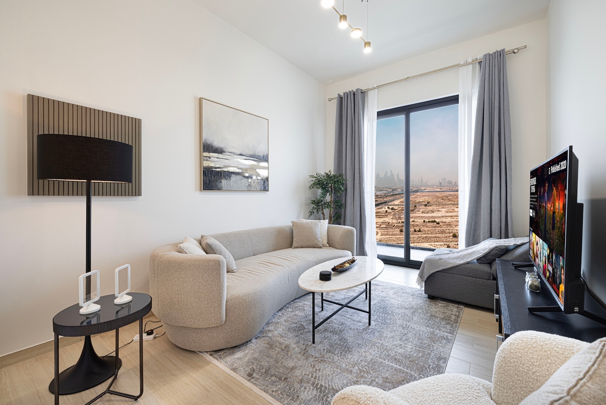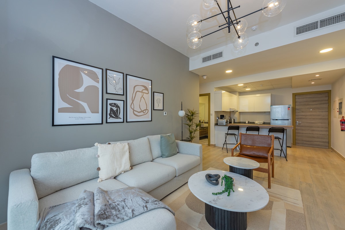 Welcome to this stylish 1-bedroom apartment in Jumeirah Village Circle. - Spacious bedroom with king-size bed - Cozy living area with Smart TV - Fully equipped kitchen with Nespresso machine - Access to pool, gym, and covered parking - Private balcony with city views - Complimentary toiletries and fast WiFi - Nearby attractions: Burj Khalifa, Dubai Mall, Palm Jumeirah - Managed by a professional team