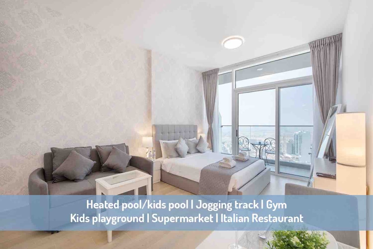 Fully equipped studio in JVC. Modern finish, premium furniture and spacious balcony with open view, confortable sitting area. Enjoy free WIFI (12Mbits minimum), Netflix and Amazon prime. GYM, Swimming pool, Kids pool, Sauna, Steam and Playground are available in the residence. Washing-Drying machine, fully equipped kitchen with cooker, microwave, fridge, oven, Nespresso Vertuo, kettle... Place is really quiet, safe and confortable with a sky fantastic view high floor. Free parking