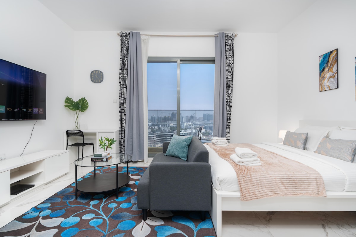 Stylish Studio in Bloom Towers, JVC, Dubai! This modern and elegantly furnished studio offers the perfect blend of comfort and convenience in the heart of Jumeirah Village Circle (JVC). Located in the prestigious Bloom Towers, this cozy space is ideal for solo travelers or couples seeking a serene retreat in Dubai.