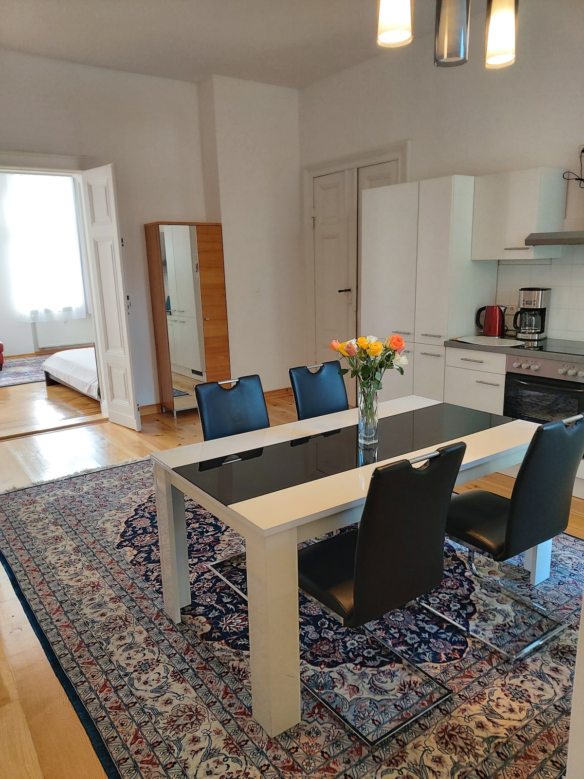 In the beautiful city of Potsdam, directly at the park Sanssouci and right across from Schloss' Charlottenhof you will find our villa built around 1850. The holiday apartment on the ground floor is spacious and family-friendly. Bed linen and towels are provided accordingly. Within walking distance you can reach the supermarket and a bakery or café for breakfast. Dogs are welcome here. We are looking forward to your interest!
