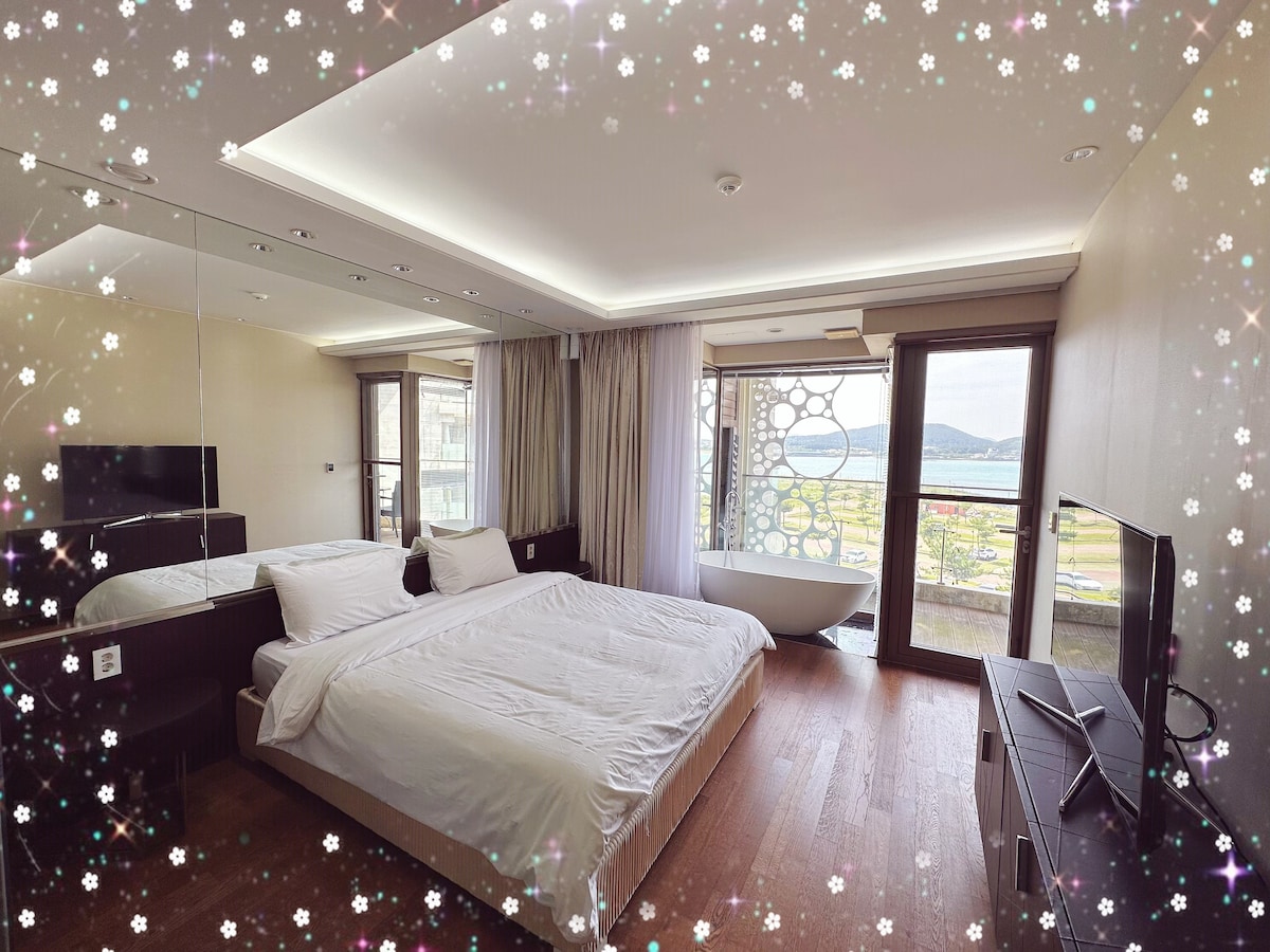 큰 통창을 통한 침대에서 성산일출봉뷰 힐링 2인 숙소 (101호) / 오조리 일출스테이